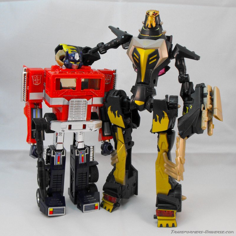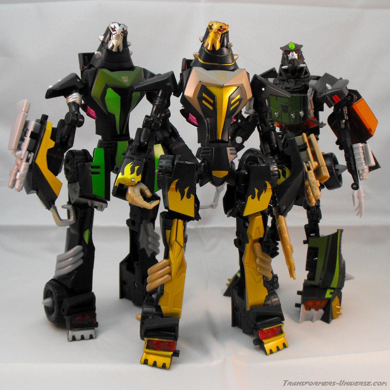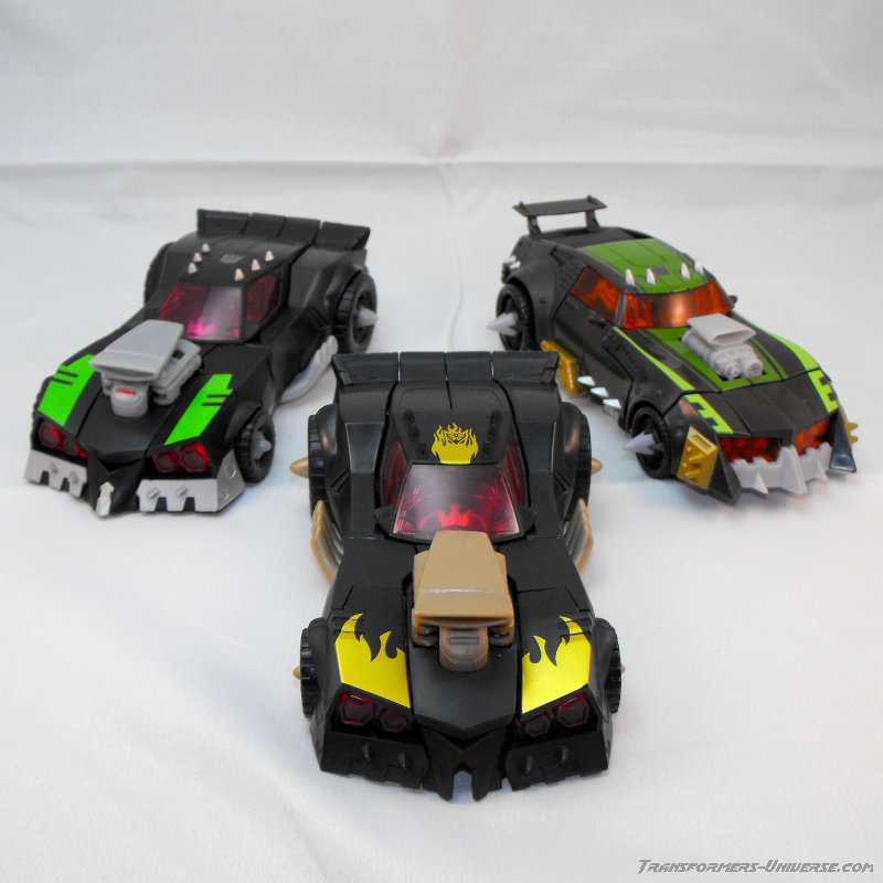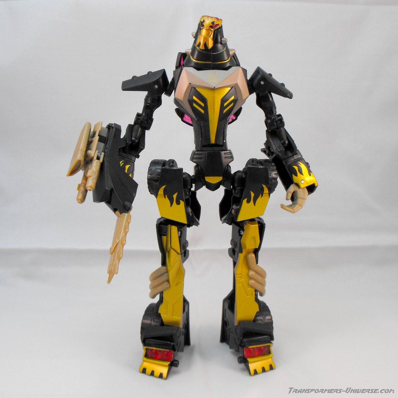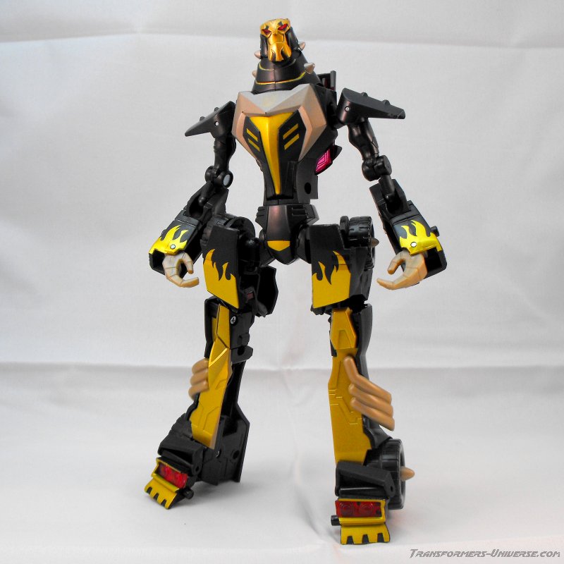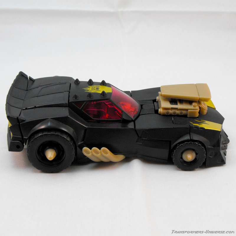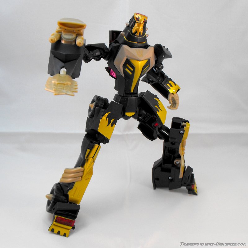 Bemerkungen: Blazing Lockdown ist ein Repaint des ersten Animated Lockdown, das komplette Review findet ihr dort. Hier nur ein paar Worte zu den Unterschieden. Zwei Dinge wurden bei der "Blazing" Version des Decepticon Kopfgeldjägers verändert. Zum einen hat er einen neuen Anstrich. Wo der erste Lockdown schwarz mit grünen und grauen Highlights war, ist dieser hier schwarz mit goldenen Highlights. Das Gold ist hier breiter vertreten als die nicht-schwarzen Farben beim ersten Lockdown und ist auf den Beinen, an den Unterarmen und am Rücken in Flammenmustern aufgebracht, was im Fahrzeugmodus zu der Motorhaube und dem Dach wird.