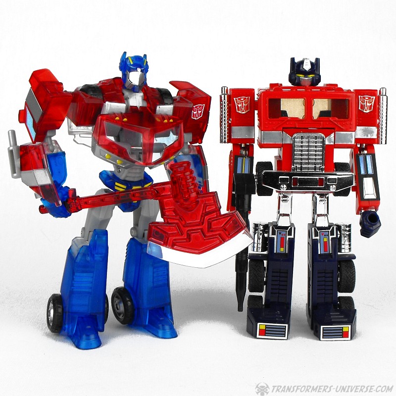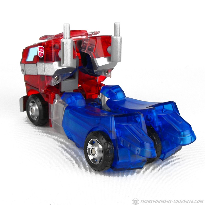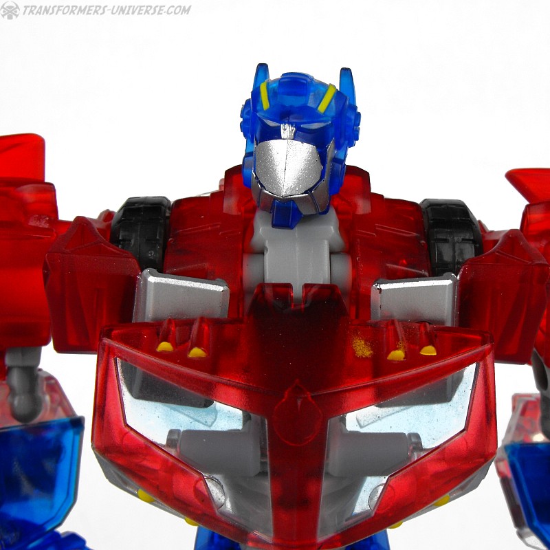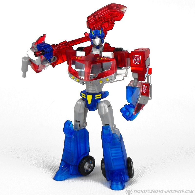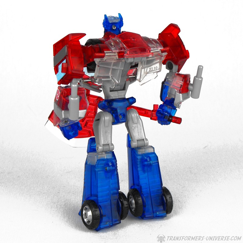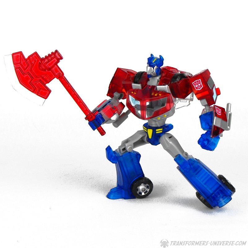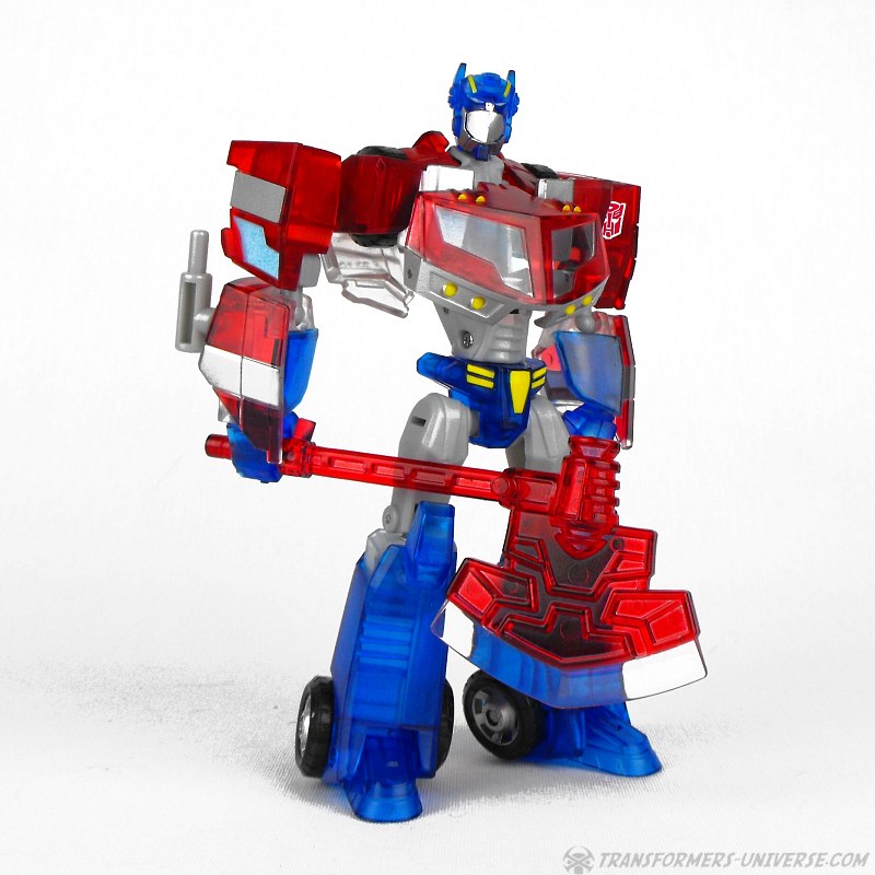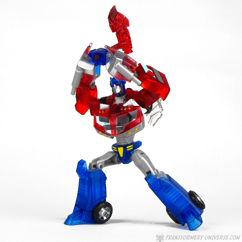 Bemerkungen: Sons of Cybertron Optimus Prime stammt aus der selben Gussform wie Animated Battle Begins Optimus Prime, den ich bereits rezensiert habe. Deshalb hier nu rein paar Wrote zu den Unterschieden. Wie schon sein Packungsmitbewohner Sons of Cybertron Rodimus wurden zahlreiche Teile von Optimus Prime aus semi-transparentem Plastik neu gegossen. Eigentlich sind nur seine grauen Teile solide geblieben, alles was blau oder rot ist, ist jetzt semi-transparent, genau wie seine Streitaxt.