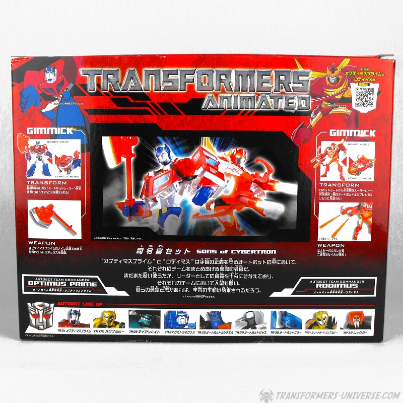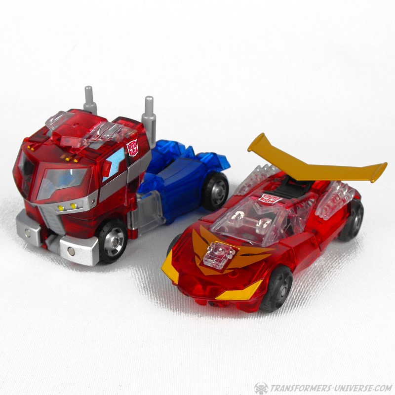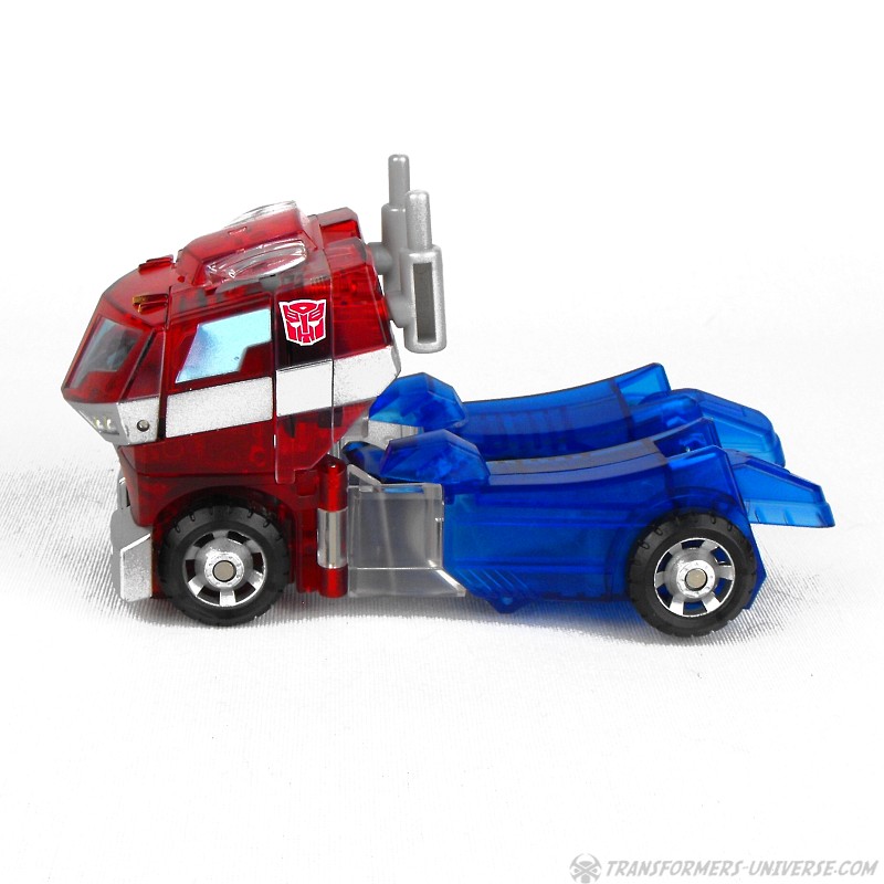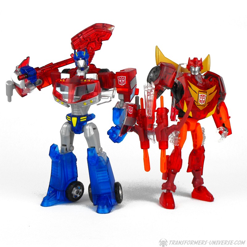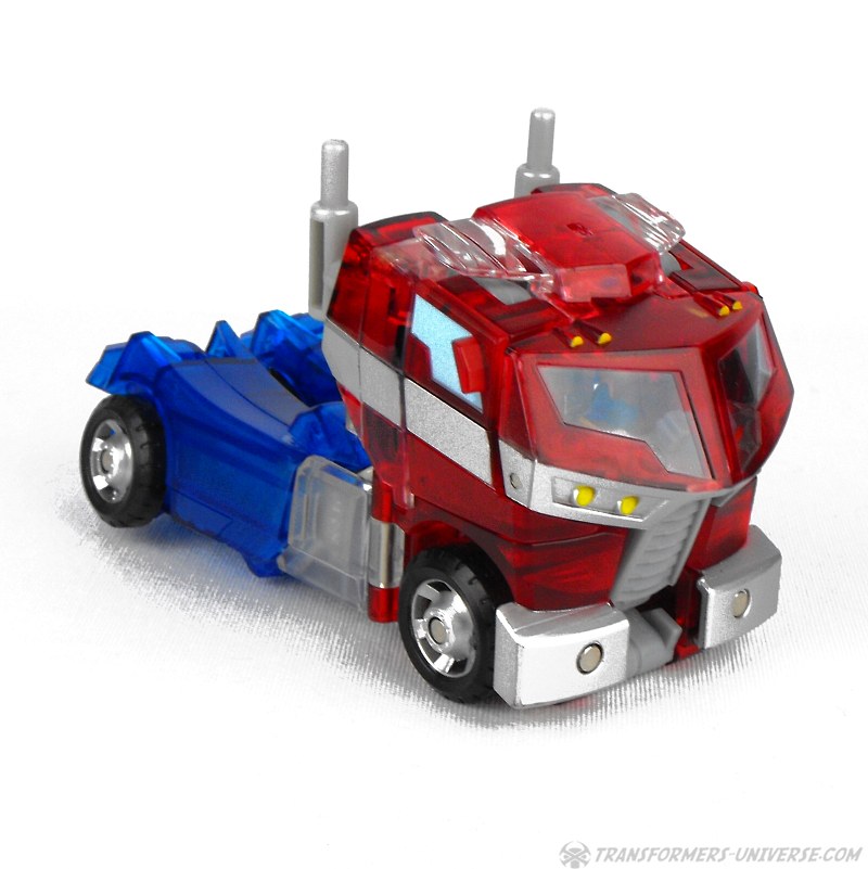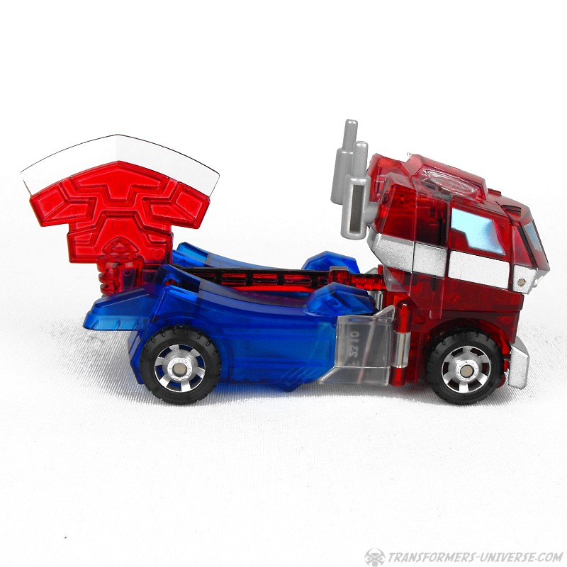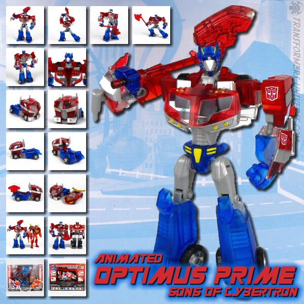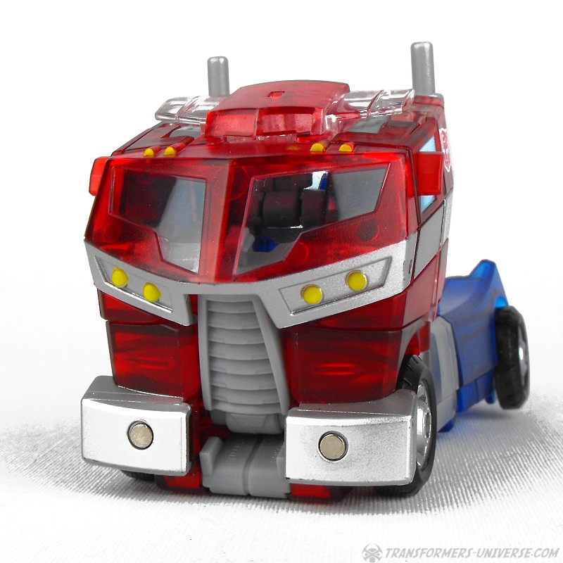 Bemerkungen: Sons of Cybertron Optimus Prime stammt aus der selben Gussform wie Animated Battle Begins Optimus Prime, den ich bereits rezensiert habe. Deshalb hier nu rein paar Wrote zu den Unterschieden. Wie schon sein Packungsmitbewohner Sons of Cybertron Rodimus wurden zahlreiche Teile von Optimus Prime aus semi-transparentem Plastik neu gegossen. Eigentlich sind nur seine grauen Teile solide geblieben, alles was blau oder rot ist, ist jetzt semi-transparent, genau wie seine Streitaxt.