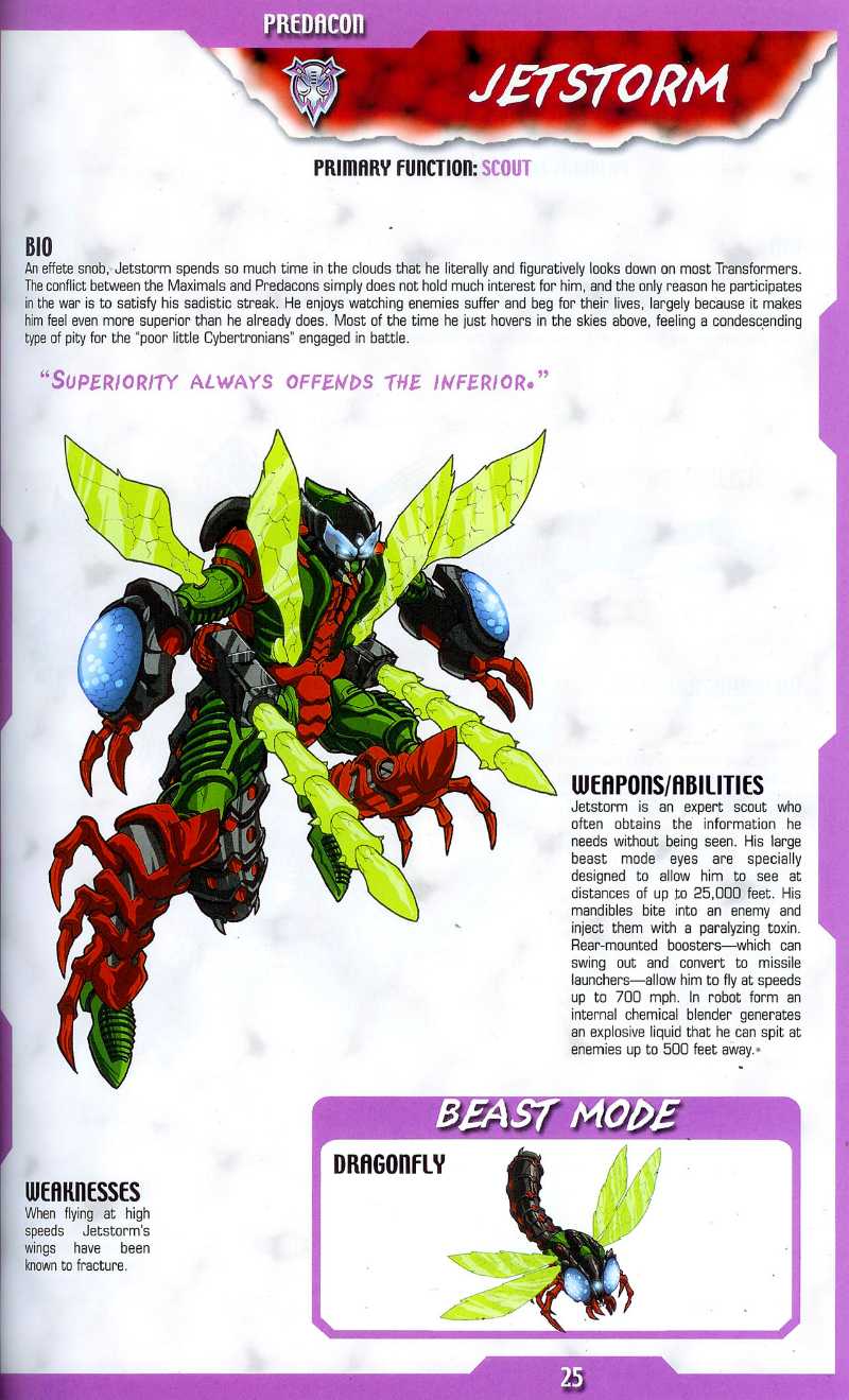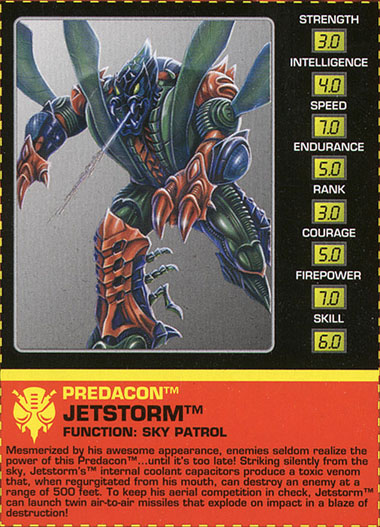 Von seiner beeindruckenden Erscheinung verzaubert erkennen die meisten Feinde die Stärke dieses Predacon nicht... bis es zu spät ist. Er greift lautlos aus der Luft an. Jetstorms interne Kühlsysteme produzieren ein tödliches Gift, welches er aus dem Mund erbricht und damit Feinde auf bis zu 500 Fuß Entfernung vernichten kann. Um die Konkurrenten in der Luft in Schach zu halten kann Jetstorm zwei Luft-Luft-Raketen abfeuern, die bei Aufprall in einem Feuerball explodieren.