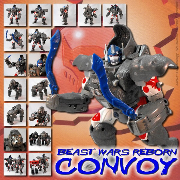 Bemerkungen: Die Geschichte dieser Ultra-Klasse Figur ist lang und kompliziert. Wir beginnen 1996 mit Optimus Primal aus Beast Wars. Ein Jahr später bringt Takara die Figur unter dem Namen Convoy für den japanischen Markt raus, zusammen mit einigen Varianten im Jahr 1998 (Real Grey Type, Skeleton Type, Burning Convoy, etc.). Hasbro holte den Jungen für die 2003er Universe Reihe nochmal in den aktiven Dienst zurück, allerdings mit potthässlicher Bemalung. Und dann kam schließlich diese Figur hier, rechtzeitig zum 10jährigen Beast Wars Jubiläum 2006. Nun begann die japanische „Telemocha“ Jubiläumsreihe allerdings erst ein Jahr später, schließlich war die Serie in Japan erst 1997 gestartet. Insofern ist Reborn Convoy, zusammen mit seinem Box-Partner Megatron, schon irgendwie ein Sonderling, speziell da für besagte Telemocha Reihe (wie gesagt nur 1 Jahr später) auch nochmal eine Version dieser Figur hier rauskam, die den neuen Roboterkopf und die Brustplatte wegließ, aber den gleichen Affenkopf hatte. Verwirrt? Gut, denn man muss annehmen, dass das Takaras Absicht bei der ganzen Geschichte war.