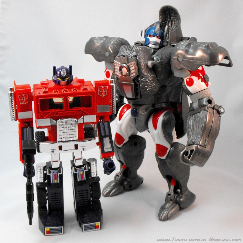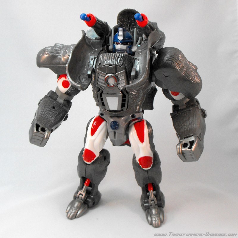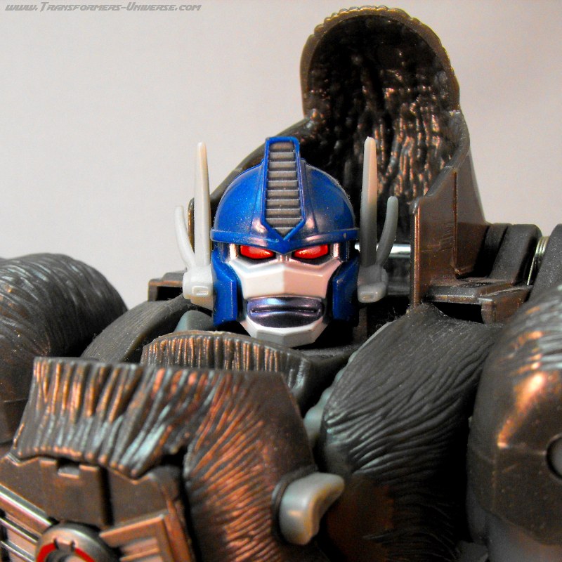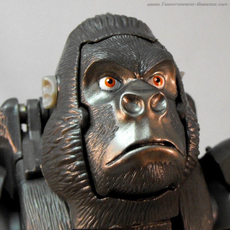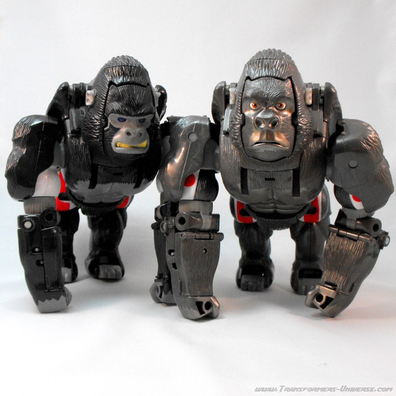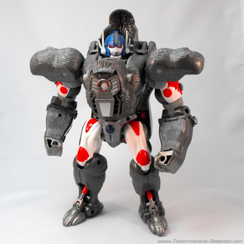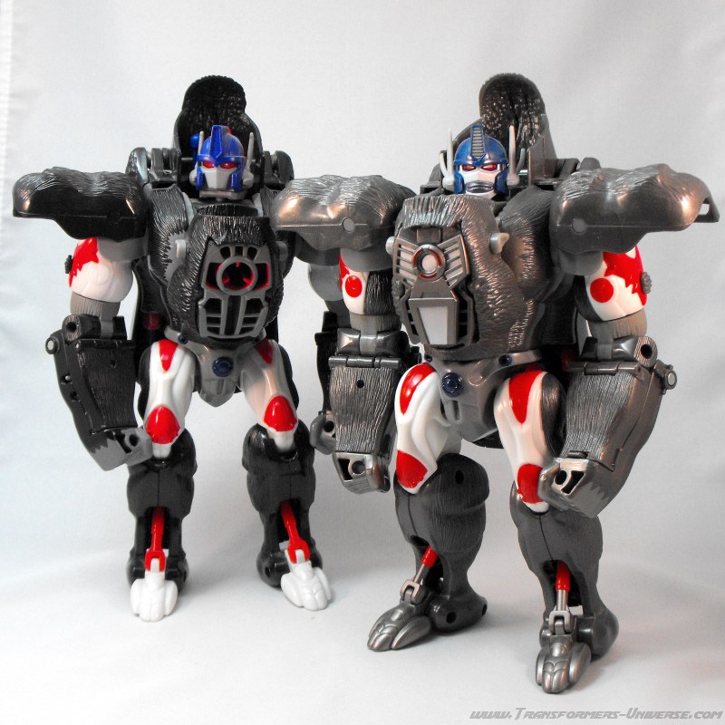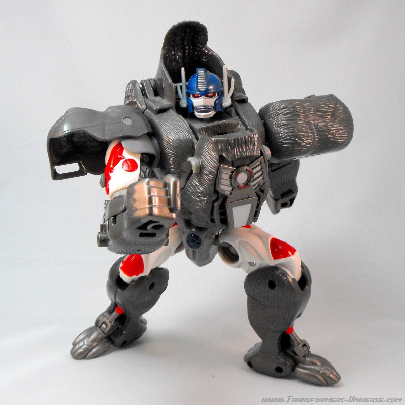 Biestmodus: Convoy verwandelt sich natürlich in einen Gorilla und von der Fellfarbe abgesehen gibt es nur einen Unterschied zur 1996er Version, nämlich das Gesicht. Die Reborn Version hat das Gesicht komplett überarbeitet und es sieht jetzt nicht nur deutlich lebensechter aus, sondern ist dem TV Gegenstück auch verdammt ähnlich. Sehr schön gemacht, muss ich sagen. Man kann fast meinen, er würde jeden Moment anfangen zu sprechen.