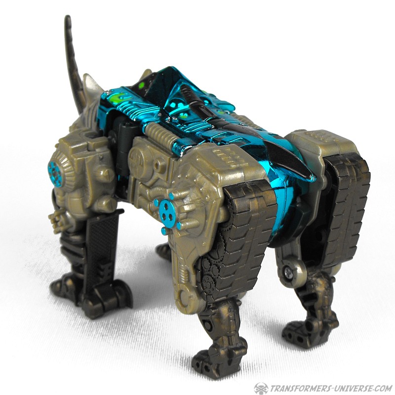 Biest Modus: Rhinox wird zu einem Rhinozeros (große Überraschung, oder?) und macht dabei eine gute Figur. Sein Biestmodus wirkt fast komplett mechanisch, kaum organische Elemente. Gefällt mir sehr gut. Wie alle Transmetals kann sein Biestmodus leicht verändert werden, um einen quasi-Fahrzeugmodus zu erhalten. In Rhinox' Fall werden seine Hinterbeine zu Panzerraupen und seine Vorderbeine zu Gleitkufen, man kriegt also eine Art Panzer. Diesen Modus mag ich nicht so besonders. Er sieht gezwungen aus und bietet meiner Meinung nach nicht viel Spielspaß.