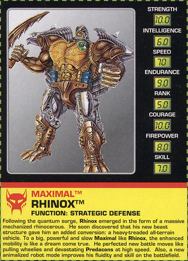 Nach dem Quantensturm erwachte Rhinox in der Form eines massigen, mechanischen Rhinozerosses. Bald schon entdeckte er, dass seine neue Bieststruktur ihm eine weitere Verwandlung ermöglichte: zum raupengetriebenen Geländefahrzeug. Für einen großen, starken, aber langsamen Maximal wie Rhinox war die verbesserte Mobilität wie ein wahrgewordener Traum. Er perfektionierte neue Kampfmanöver wie scharfe Kurven und Predacons mit Höchstgeschwindigkeit zu überrollen. Außerdem gibt ihm sein animalisierter Robotermodus mehr Beweglichkeit und Geschick auf dem Schlachtfeld.