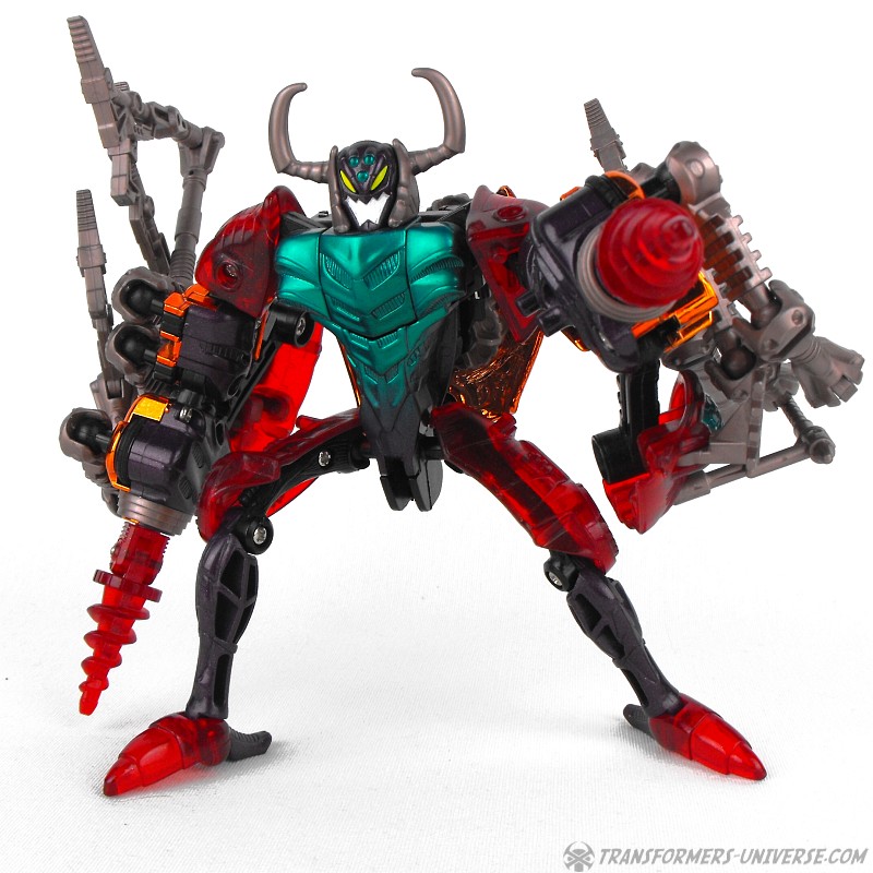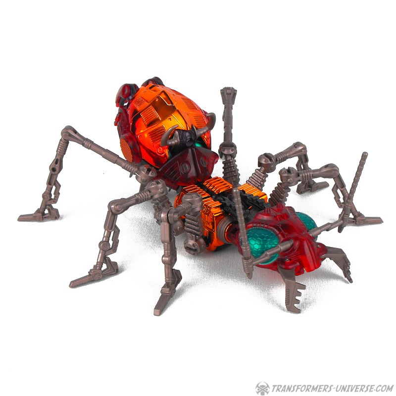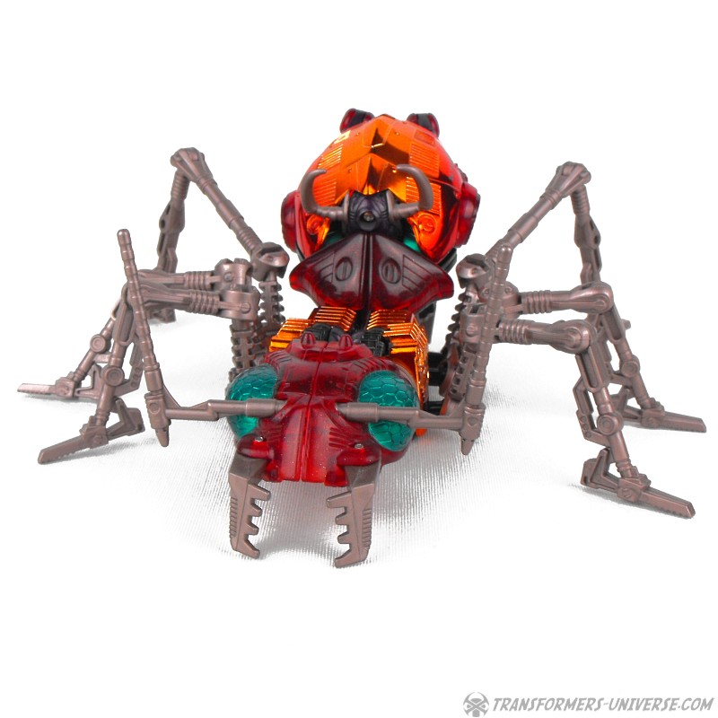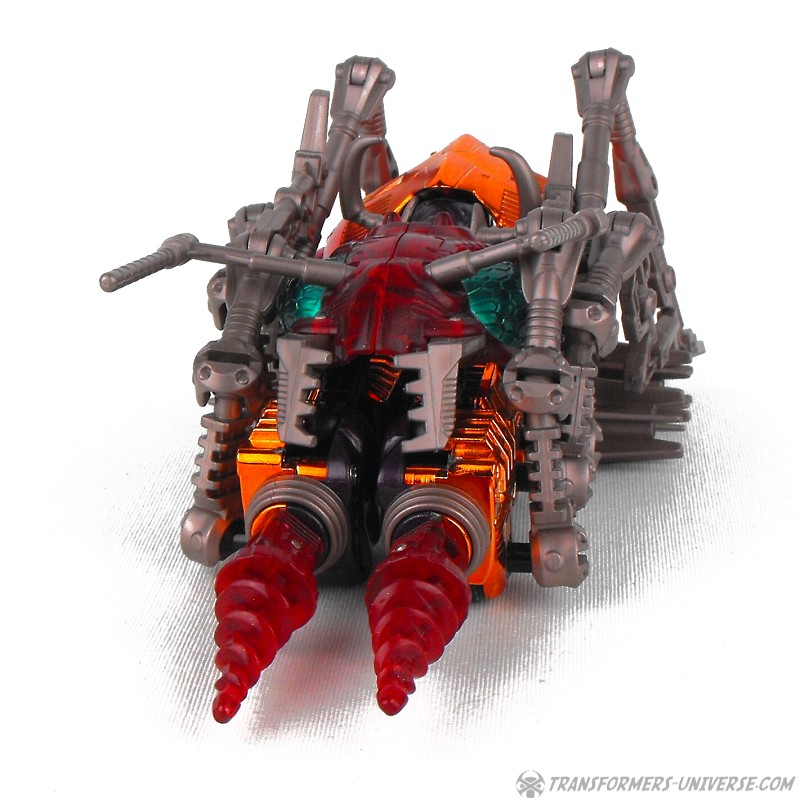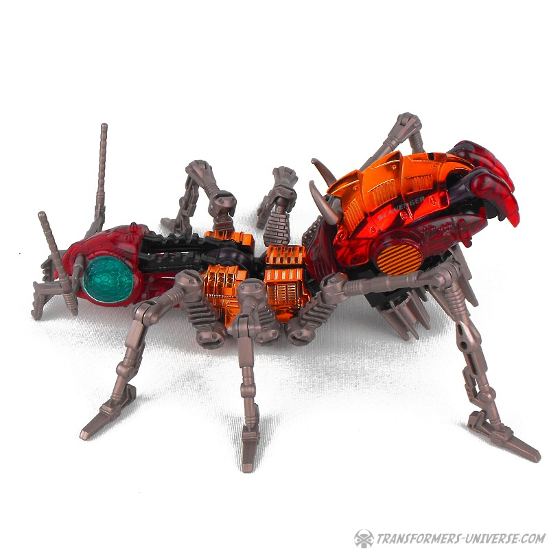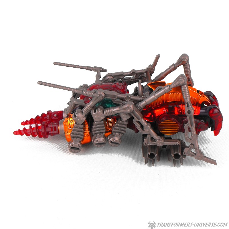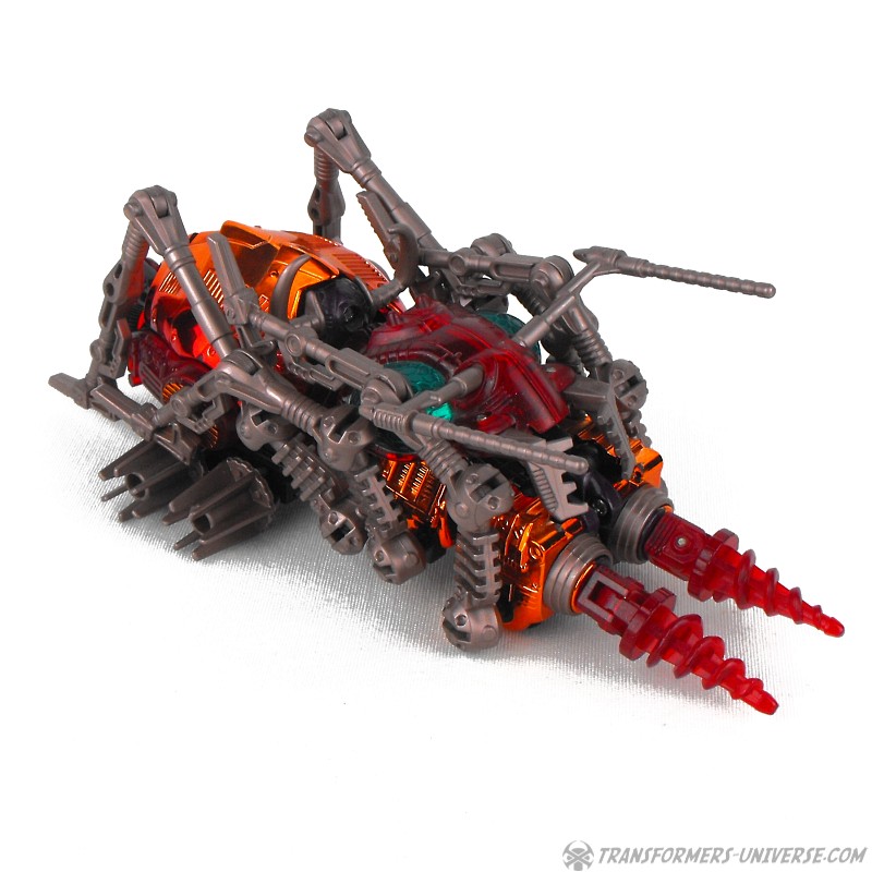 Biest Modus: Falls man den Roboter noch nicht als Transmetal Version von Inferno erkannt hat, im Biestmodus führt kein Weg mehr dran vorbei. Scavenger wird zu einer robotischen Feuerameise und sieht dabei ziemlich gut aus. Der einzige kleine Nachteil dieses Modus ist, dass seine Ameisenbeine zu schwach sind, um sein Körpergewicht zu tragen, weshalb er immer mit der Mitte auf dem Boden schleift. Ist aber nicht wirklich schlimm. Wie alle Transmetals kann Scavengers Biestmodus leicht modifiziert werden, um einen Fahrzeugmodus zu schaffen. In seinem Fall ist es ein Bohrfahrzeug. Der Ameisenkopf klappt nach hinten, die Beine werden eingezogen, und schon rollt er bohrend seinen Weg. Die Bohrer drehen sich, wenn man das Fahrzeug über den Boden rollt. Kein schlechter Fahrzeugmodus, aber es gibt bei anderen Transmetals bessere.