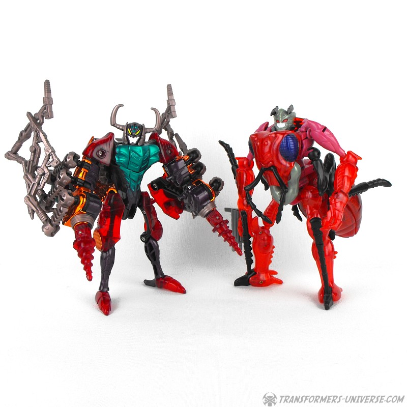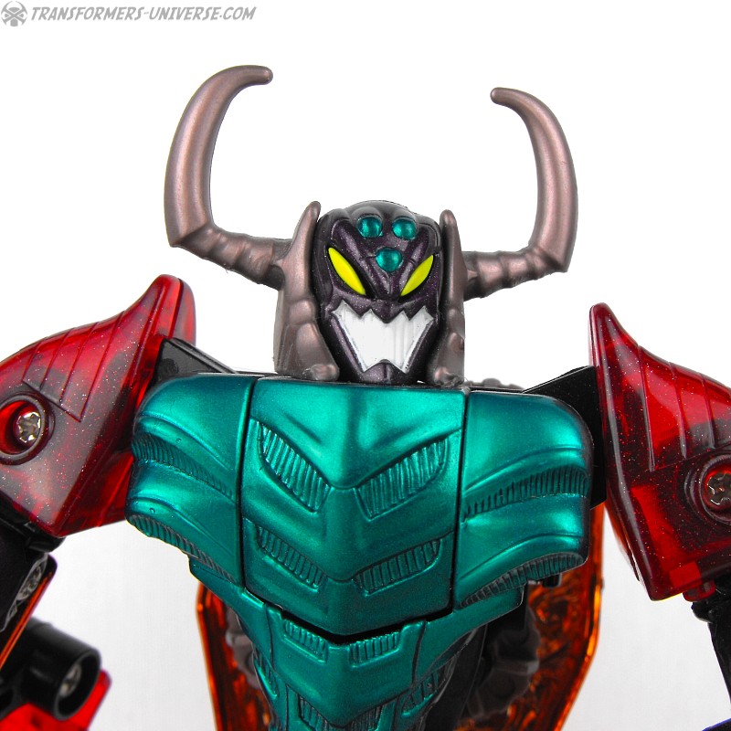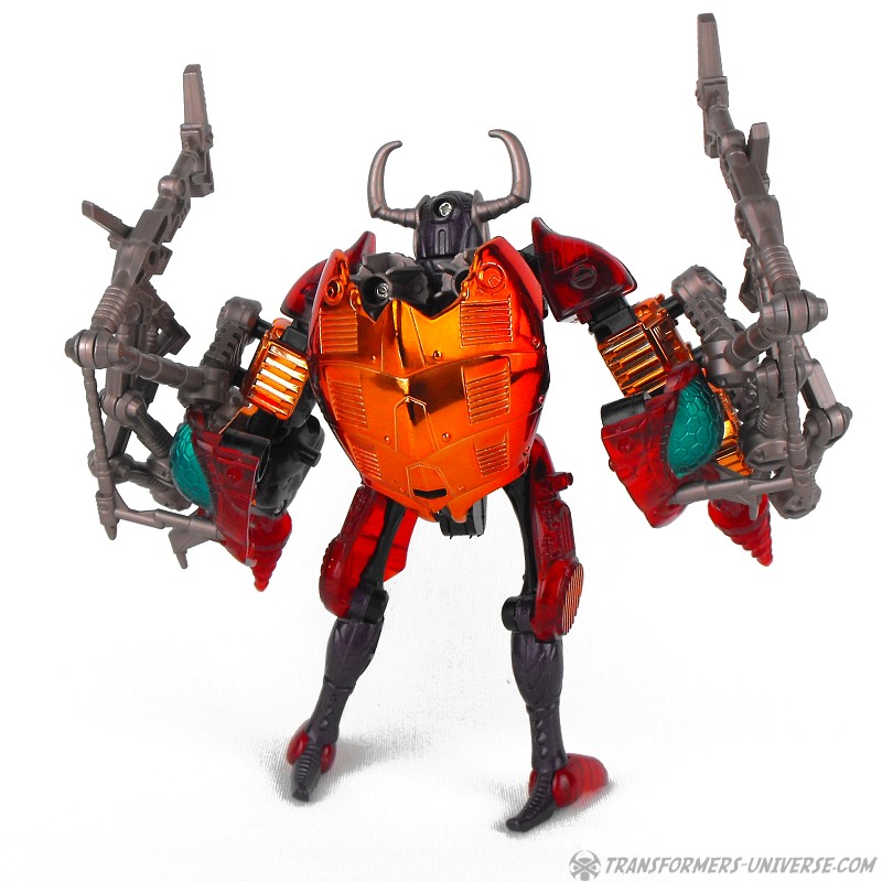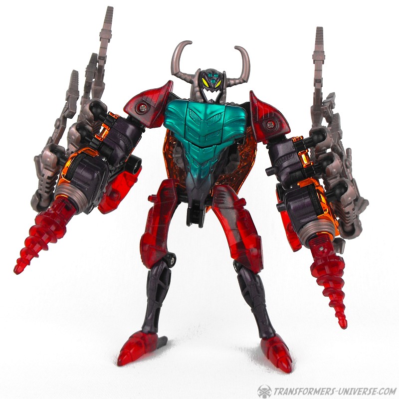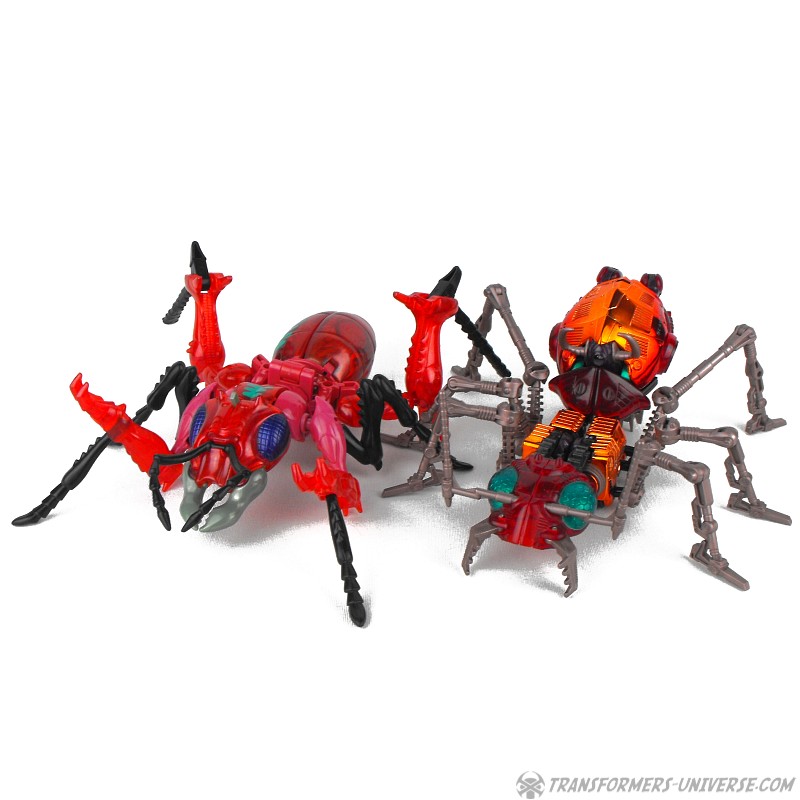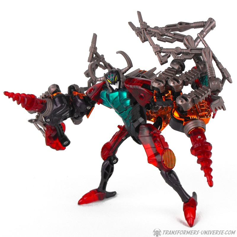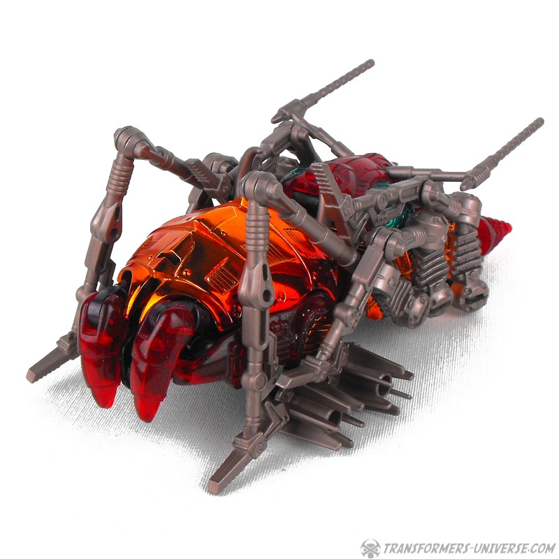 Biest Modus: Falls man den Roboter noch nicht als Transmetal Version von Inferno erkannt hat, im Biestmodus führt kein Weg mehr dran vorbei. Scavenger wird zu einer robotischen Feuerameise und sieht dabei ziemlich gut aus. Der einzige kleine Nachteil dieses Modus ist, dass seine Ameisenbeine zu schwach sind, um sein Körpergewicht zu tragen, weshalb er immer mit der Mitte auf dem Boden schleift. Ist aber nicht wirklich schlimm. Wie alle Transmetals kann Scavengers Biestmodus leicht modifiziert werden, um einen Fahrzeugmodus zu schaffen. In seinem Fall ist es ein Bohrfahrzeug. Der Ameisenkopf klappt nach hinten, die Beine werden eingezogen, und schon rollt er bohrend seinen Weg. Die Bohrer drehen sich, wenn man das Fahrzeug über den Boden rollt. Kein schlechter Fahrzeugmodus, aber es gibt bei anderen Transmetals bessere.