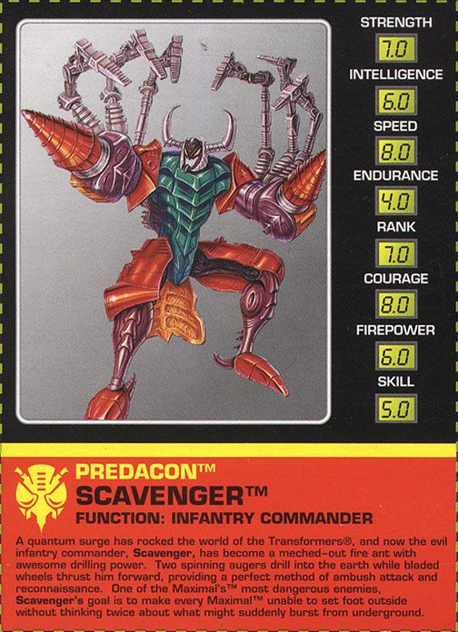 Ein Quantensturm hat die Welt der Transformer erschüttert und den bösen Infantriekommandanten Scavenger in eine mechanische Feuerameise mit beachtlicher Bohrkraft verwandelt. Zwei rotierende Bohrer graben sich in die Erde, bewehrte Räder tragen ihn vorwärts und ermöglichen ihm eine perfekte Methode des Überraschungsangriffs und der Erkundung. Scavenger ist einer der gefährlichsten Feinde der Maximals und will erreichen, dass sich keiner von ihnen mehr nach draußen traut, ohne sich Sorgen zu machen, was plötzlich aus dem Boden schießen könnte.
