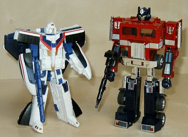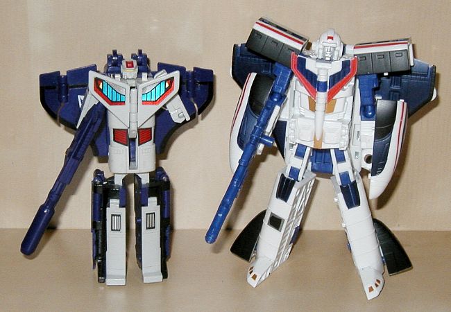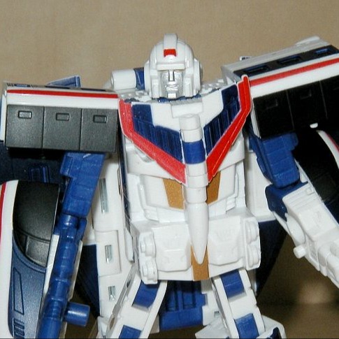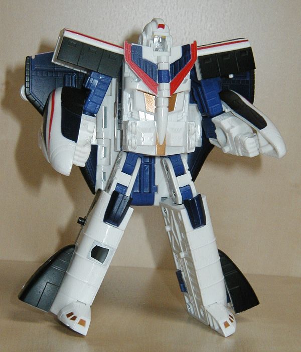 Robotermodus: Astrotrain vereint im Robotermodus das beste beider Welten. Er sieht dem originalen Astrotrain sehr ähnlich, vermeidet aber einige der Designprobleme, die das Original hatte, wie die zu kurzen Arme oder den zu großen Spoiler auf der Brust. Seine Beweglichkeit ist ziemlich gut und seine Waffe ist (ebenfalls verbessert ggü. dem Original) von richtiger Größe. Er sieht ganz allgemein gut aus. Wenn mir eine Sache nicht gefällt, dann ist es, dass man seine Gesichtszüge aufgrund der einheitlich weißen Farbe kaum erkennen kann. Ein paar Farbtupfer mehr hätten hier Wunder gewirkt. Trotzdem, ein sehr guter Robotermodus.