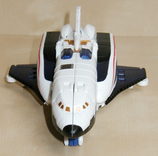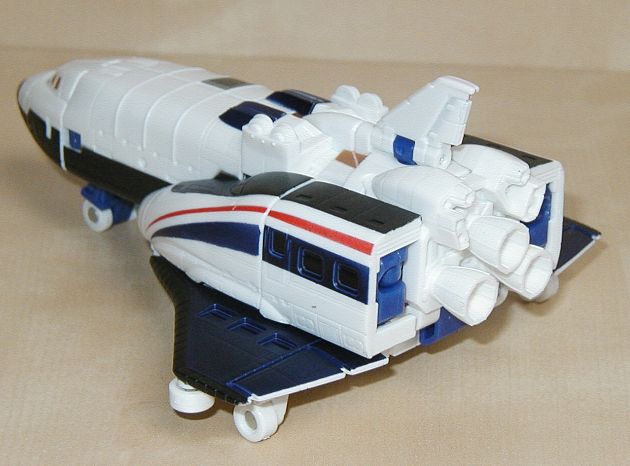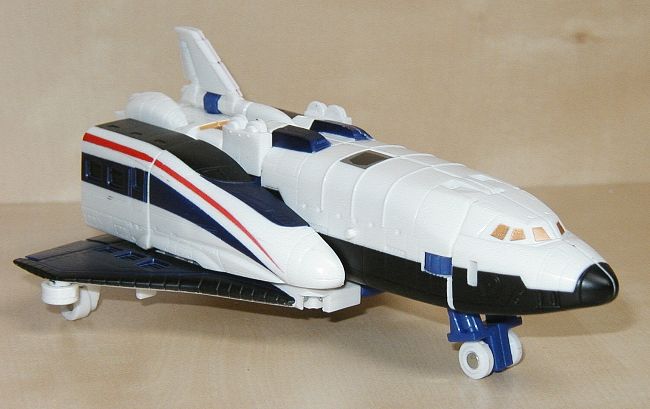 Fahrzeugmodi: Als Triplechanger hat Astrotrain zwei Fahrzeugmodi. Der erste und bei weitem bessere ist das Space Shuttle. Größtenteils sieht es genauso aus, wie man es von einem Space Shuttle erwartet. Die beiden Hälften des Zugcockpits sitzen auf den Flügeln auf, aber das schadet dem Look eigentlich nicht. Was mich ein wenig stört sind die kleinen Räder oben drauf und an den Flügelspitzen, die schaden dem Look schon ein wenig, aber trotzdem ein guter Shuttle Modus.