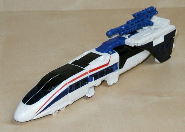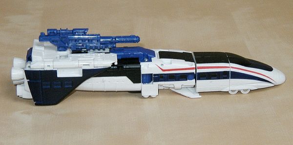Der zweite Fahrzeugmodus ist ein Zug. Anders als die klassische Lokomotive des Originals haben wir hier eine Art ICE oder japanischen Bullet Train. Ich habe zwar kein Problem damit, den Look des Zuges grundsätzlich zu modernisieren, aber womit ich ein Problem habe ist, dass das hintere Ende des Zuges einfach nicht wie ein Zug aussieht. Der Zugmodus ist irgendwie nichts Halbes und nichts Ganzes. Man kann oben drauf Astrotrains Gewehr befestigen, aber das hilft nicht wirklich. Mit Abstand der schlechteste von Astrotrains drei Modi.