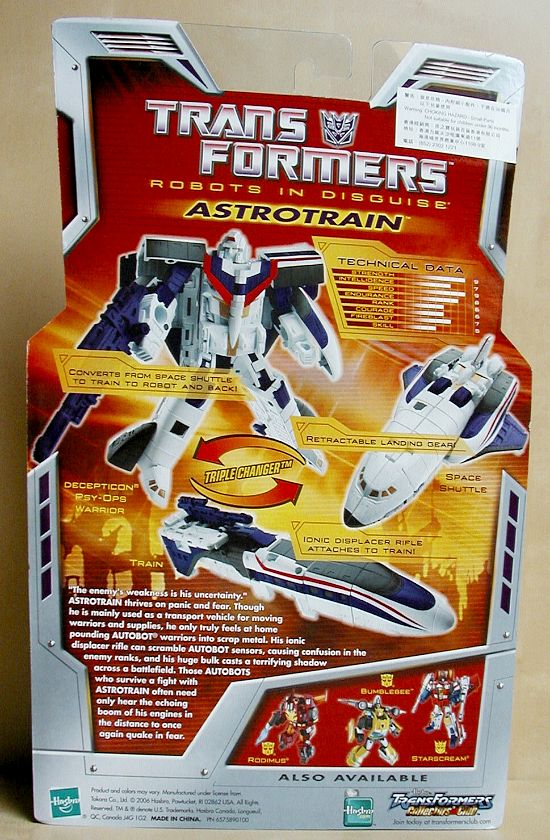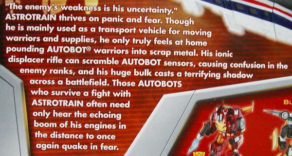Astrotrain liebt es, Panik und Angst zu verbreiten. Obwohl er hauptsächlich als Transportfahrzeug für Krieger und Nachschub genutzt wird, fühlt er sich nur wirklich wohl, wenn er Autobots zu Schrott zermalmen kann. Sein Ionisches Störgewehr kann Autobot Sensoren stören und so Verwirrung in den feindlichen Rängen verbreiten. Seine riesige Erscheinung wirft einen furchterregenden Schatten auf das Schlachtfeld. Die Autobots, die einen Kampf mit Astrotrain überleben, brauchen oft nur den Klang seiner Motoren in der Ferne hören, um erneut vor Angst zu erzittern.