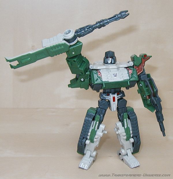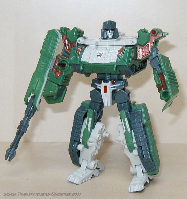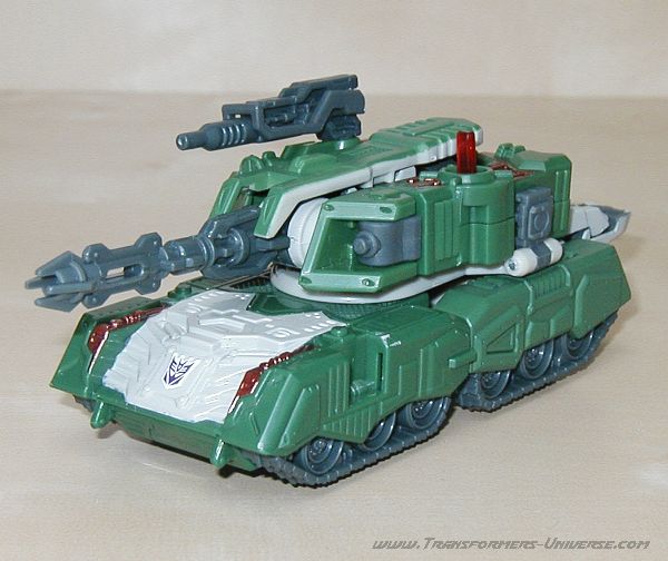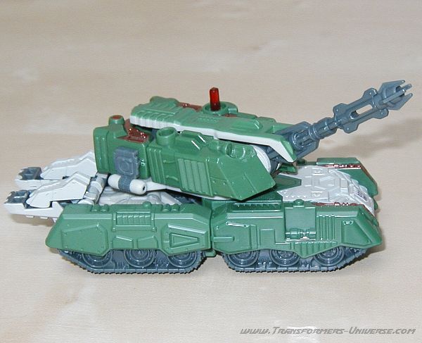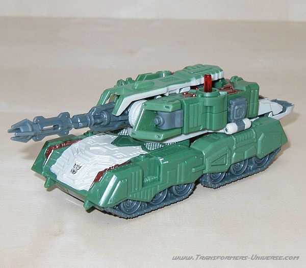 Fahrzeugmodus: Megatron verwandelt sich in einen grünen Panzer. Anders als bei anderen Panzer Transformer kann sich sein Geschützturm tatsächlich um 360 Grad drehen und die Waffe kann sogar nach oben zeigen. Die Handwaffe aus seinem Robotermodus kann als zusätzliches Geschütz montiert werden. Die Detaillierung auf dem Panzer ist auch gut gemacht. Alles in allem also ein guter Fahrzeugmodus mit kaum Grund zur Beschwerde.