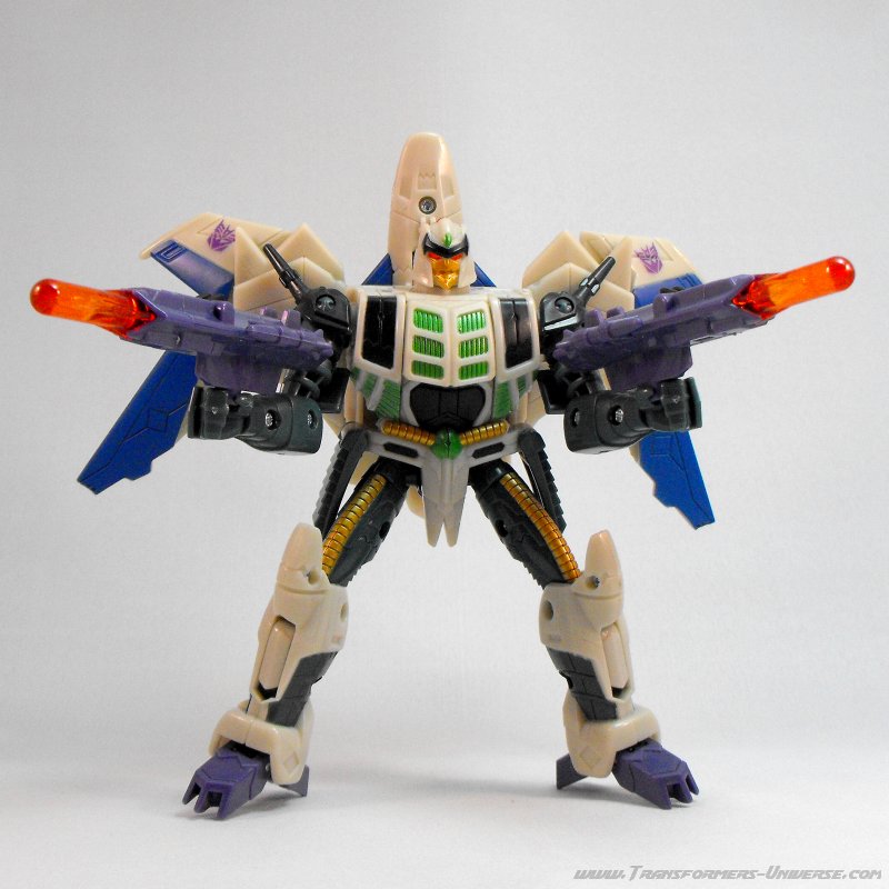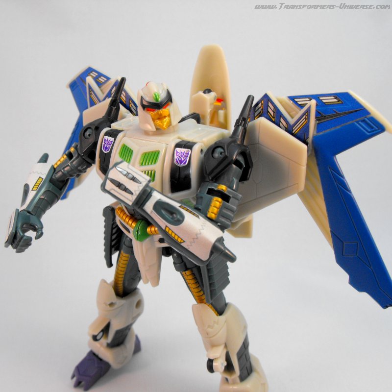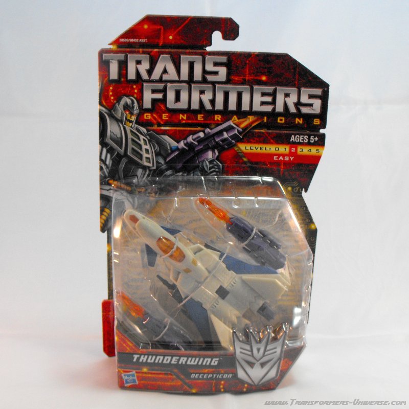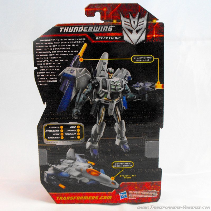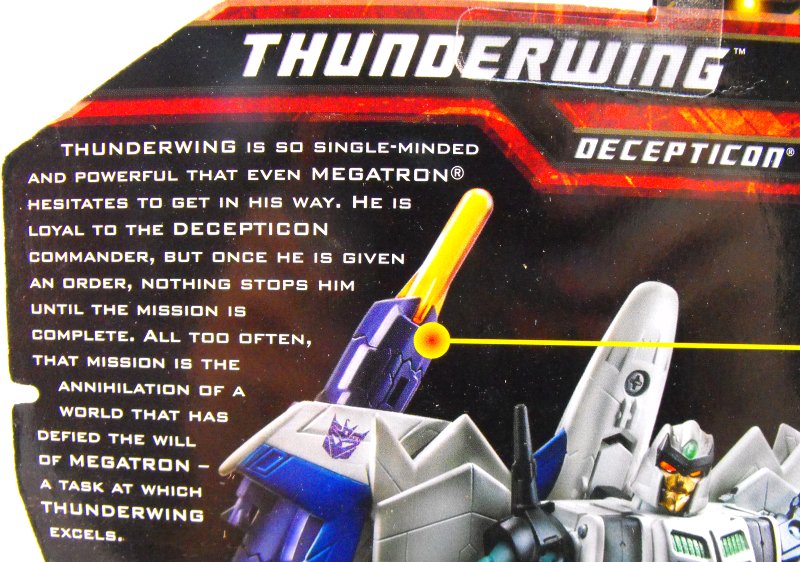 Bemerkungen: Obwohl er nie in irgendeinem Cartoon mitgespielt hat, hat Thunderwing eine lange Geschichte in den diversen Transformers Comics. In den alten Marvel Ausgaben war er eine Zeitlang Decepticon Anführer und außerdem der erste und einzige Decepticon, der erfolgreich die Matrix trug. Allerdings wurde er später von dessen Macht übermannt. In den IDW Comics war er ein Wissenschaftler, der den Niedergang Cybertrons vorhersah und sich selbst als Versuchskaninchen für seine verbotenen Pretender-Experimente benutzte. Dies verwandelte ihn in ein geistloses, unaufhaltbares Monster, dass Cybertron auf Jahrhunderte hinaus unbewohnbar machte. Erkennt ihr einen Trend?