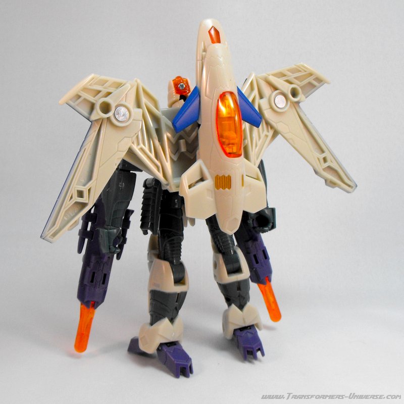Was nicht bedeuten soll, dass das hier ein schlechter Robotermodus ist. Bei weitem nicht. Er sieht cool aus, ist bis auf die kleine Einschränkung oben sehr beweglich, und außerdem gut bewaffnet. Die zwei Raketenwerfer kann er entweder an den Flügeln montieren oder in seinen Händen halten, die wieder mal nicht die einfachen Faust-mit-Loch-drin sind, sondern offen und schön skulptiert. Allerdings ist der Robotermodus leider nicht so gut, wie er hätte sein können, deshalb gibt’s ein wenig Punktabzug.