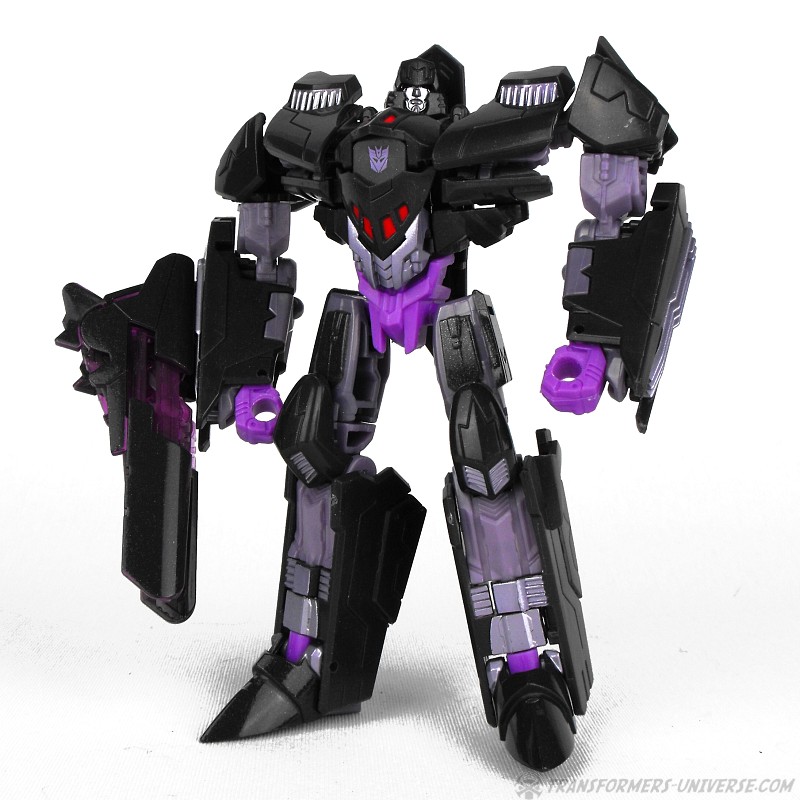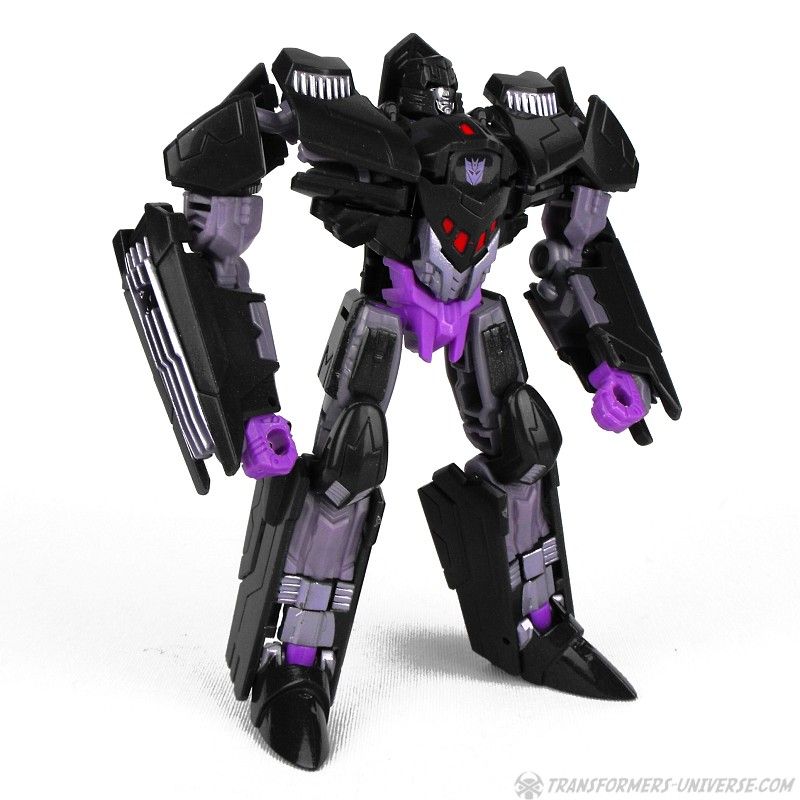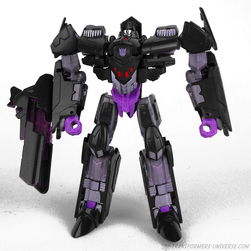 Obwohl er für eine Deluxe Figur eher klein geraten ist (War for Cybertron Megatron ist größer und breiter) schafft es der Roboter, durch seinen breiten Oberkörper und die kräftigen Beine ein Gefühl der Stärke zu vermitteln. Der schwarze Anstrich mit den lila Akzenten gefällt mir sehr gut und die große Kanone auf dem Arm komplettiert den gefährlichen Look. Zum Thema Waffe: die Kanone ist eigentlich mehr eine Gabel und soll laut Comics eine sog. Rail Gun (magnetische Schienenkanone) darstellen, wird auf der Packung aber klassisch als Fusionskanone bezeichnet. So oder so, eine große Wumme auf dem Arm (rechts wie links, wie ihr wollt) muss ja für einen Megatron sein.