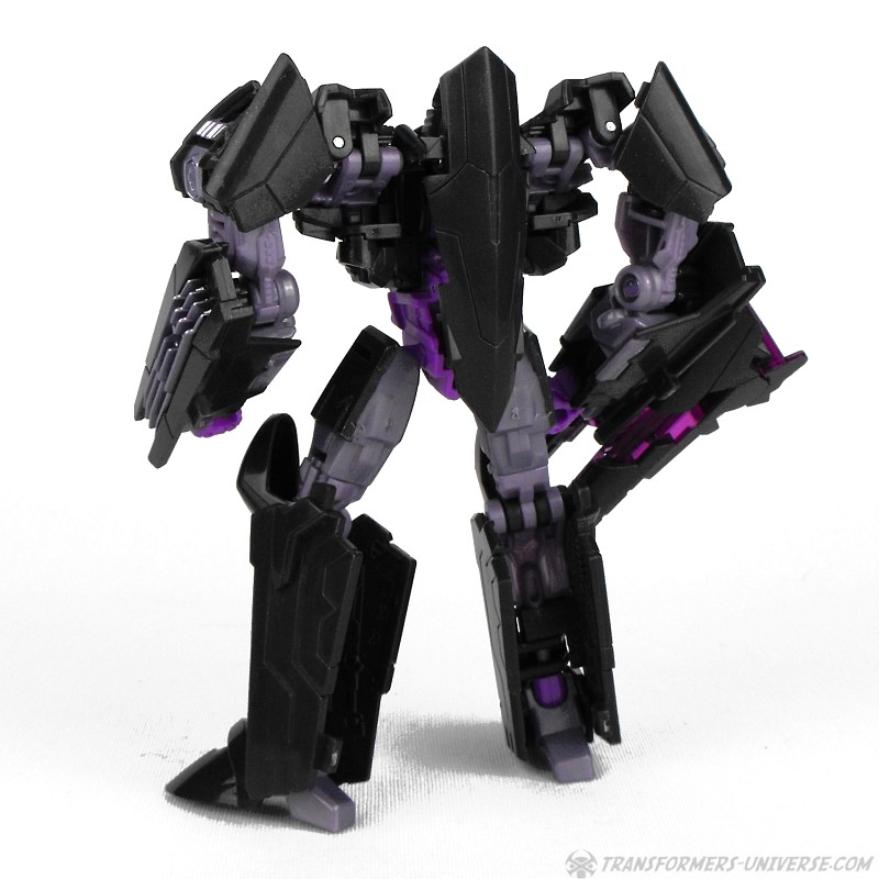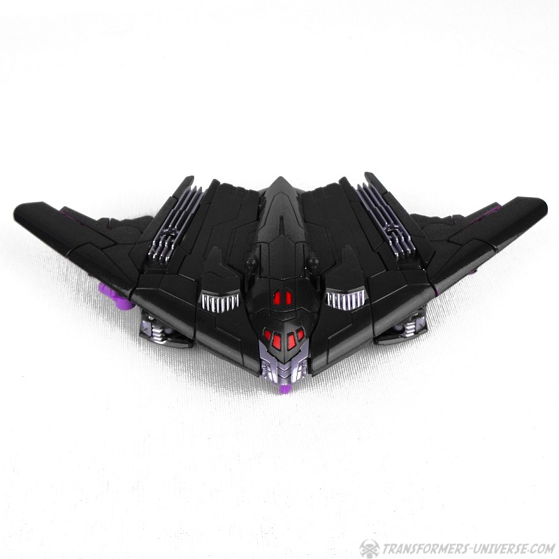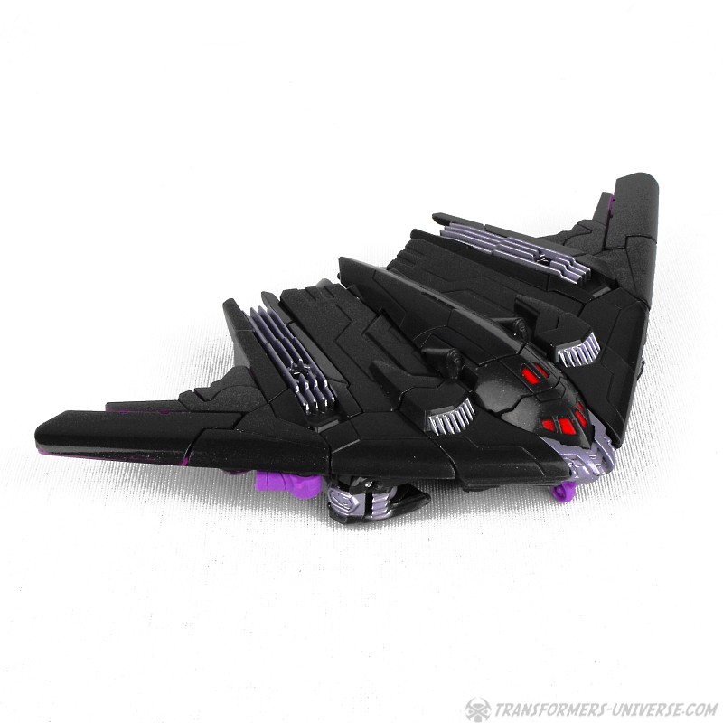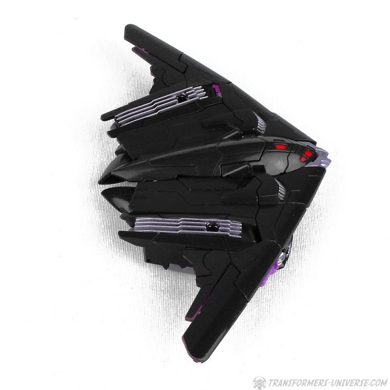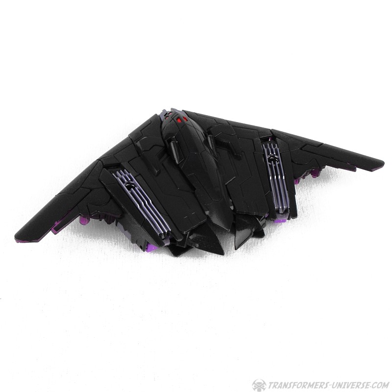 Alternativmodus: Megatron transformiert sich in einen größtenteils schwarzen Tarnkappenbomber, der Ähnlichkeit mit dem Northrop Grumman B-2 Spirit hat. Die Flügel werden aus den beiden Hälften von Megatrons Waffe geformt, der Roboter wird zum eigentlichen Chassis des Bombers. Das Resultat ist ein überraschend aerodynamisches Fluggerät mit nur sehr wenig Unterbau. Wenn man genau hinsieht, dann erspäht man Megatrons Zehen, die hinten rausstehen, aber das war’s dann auch schon. Der Bomber bietet jetzt kein Gimmick oder so was, braucht er aber auch nicht. Unterm Strich ein sehr effizienter, gut entwickelter Fahrzeugmodus. Keinerlei Beschwerden.