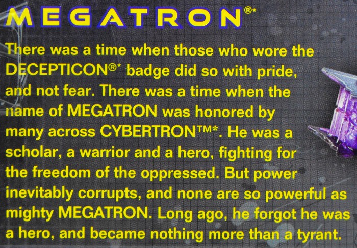 Es gab eine Zeit, da waren diejenigen, die das Decepticon Zeichen trugen, von Stolz erfüllt anstatt von Angst. Es gab eine Zeit, da wurde der Name Megatron von vielen auf Cybertron verehrt. Er war ein Gelehrter, ein Krieger, ein Held, der für die Freiheit der Unterdrückten kämpfte. Aber Macht korrumpiert und nur wenige haben mehr davon, als der mächtige Megatron. Schon vor langer Zeit vergaß er, dass er ein Held war, und wurde nur zu einem weiteren Tyrannen.