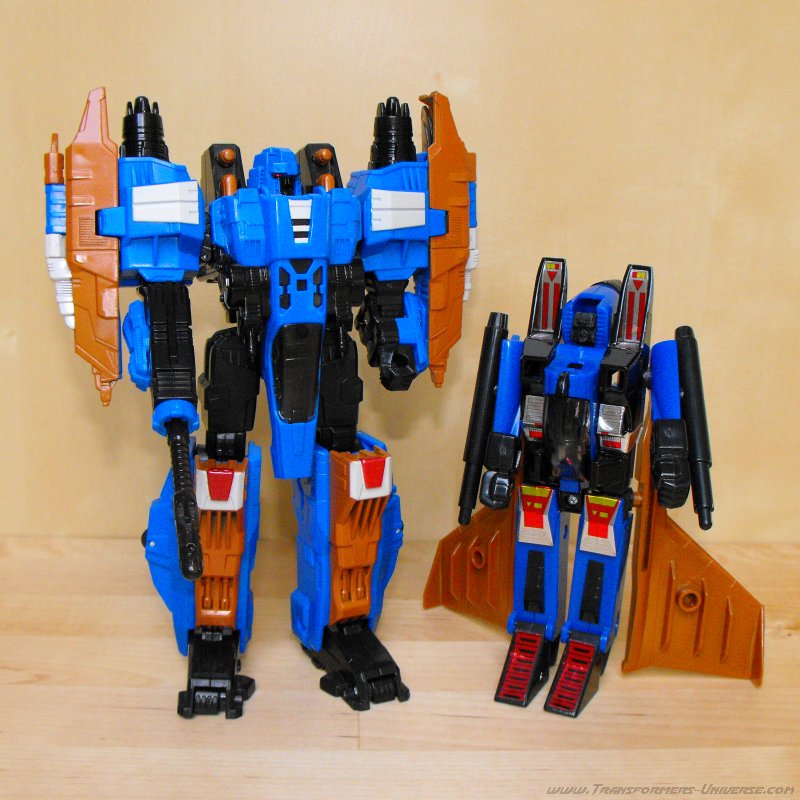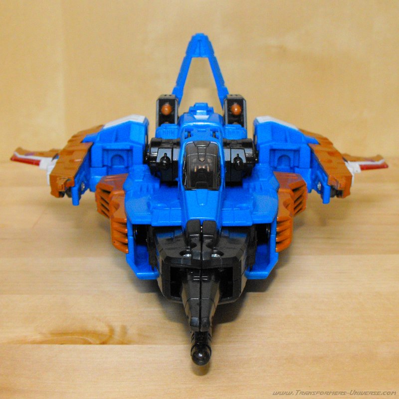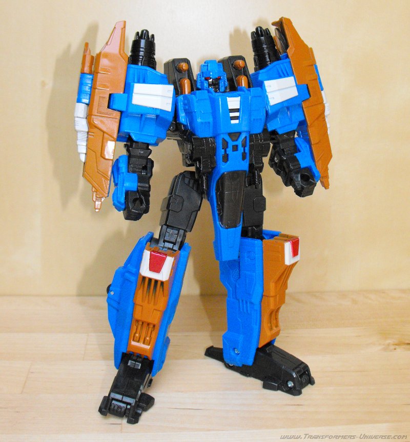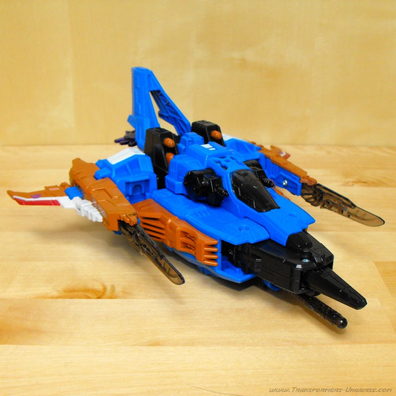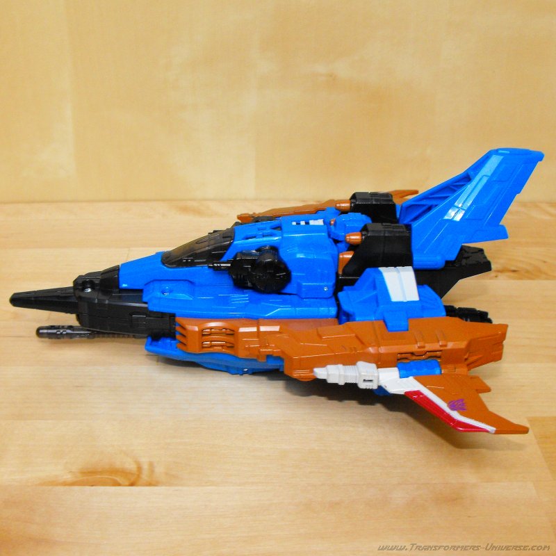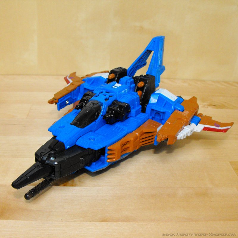 Bemerkungen: Dirge ist ein Repaint von Cybertron Starscream, das komplette Review findet ihr dort. Hier nur ein paar Worte zu den Unterschieden. Dirge zeigt sich in seinen traditionellen Farben blau, schwarz und braun, die an dieser Figur zuemlich gut aussehen. Es erstaunt mich immer wieder, dass dieser doch seltsam anmutende Farbmix so gut funktioniert, aber er tut es. Leider ist das blau in einem Ton, der auf Fotos ziemlich körnig rauskommt, aber er sieht toll aus, wenn man ihn mit dem alten Augapfel 1.0 betrachtet.