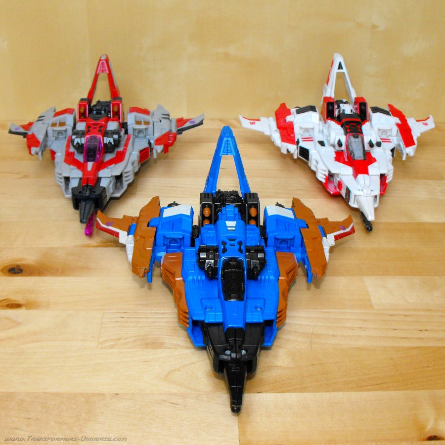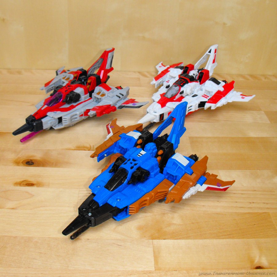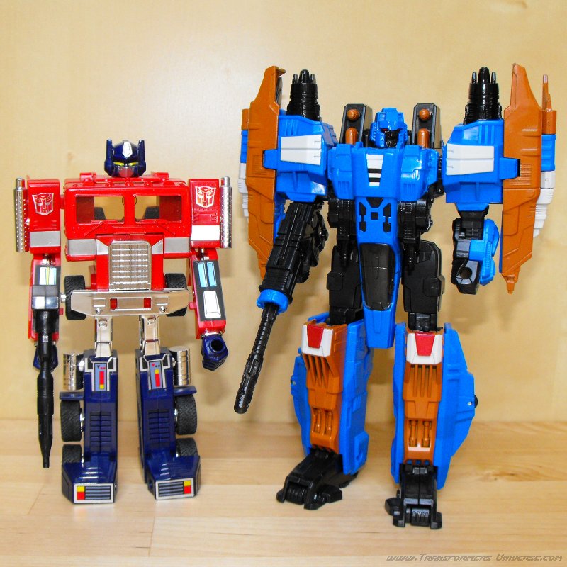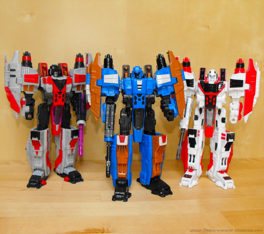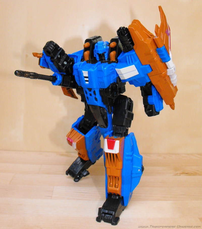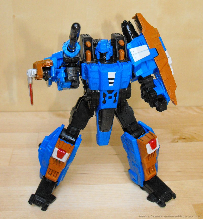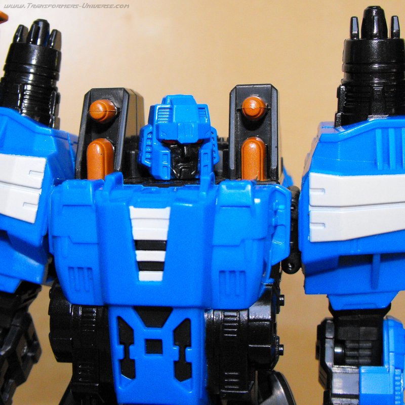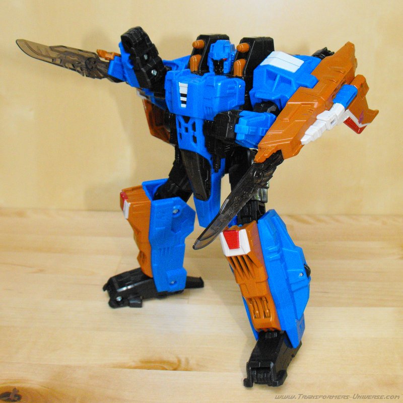 Obwohl ihm sein klassischer Spitzkopf fehlt, hat Universe Dirge doch recht große Ähnlichkeit mit seinem G1 Vorgänger. Womit ich nicht so hundertprozentig zufrieden bin ist das komplett schwarze Gesicht. Zumindest für die Augen hätte man hier eine andere Farbe heranziehen können. Das gleiche gilt für die Schwerter. Durchsichtiges schwarzes Plastik... ein dunkles rot oder blasses blau hätte hier denke ich besser ausgesehen. Trotzdem, die Figur selbst ist toll und die Farben sehen größtenteils toll aus, bis auf die eben angesprochenen Ausnahmen.