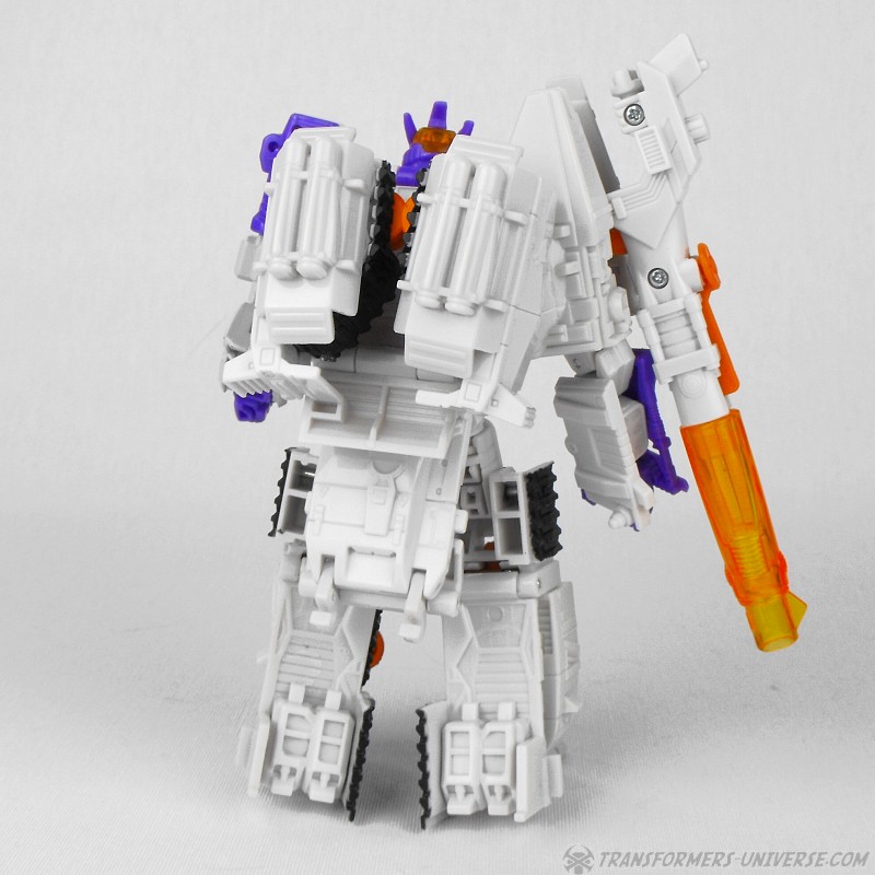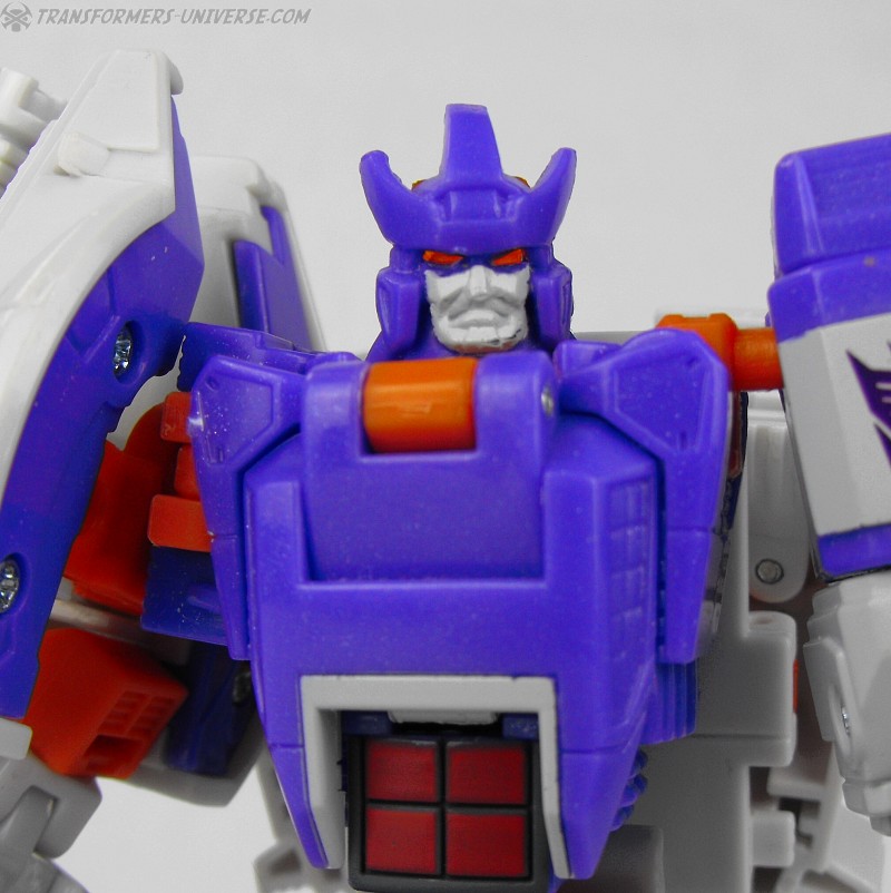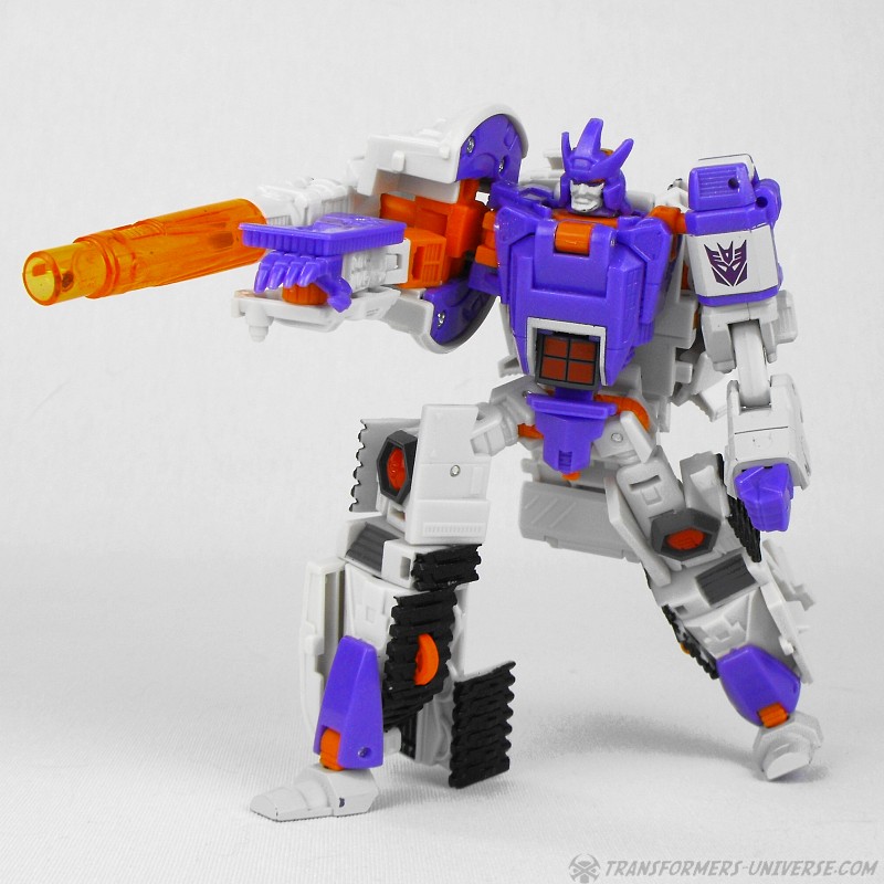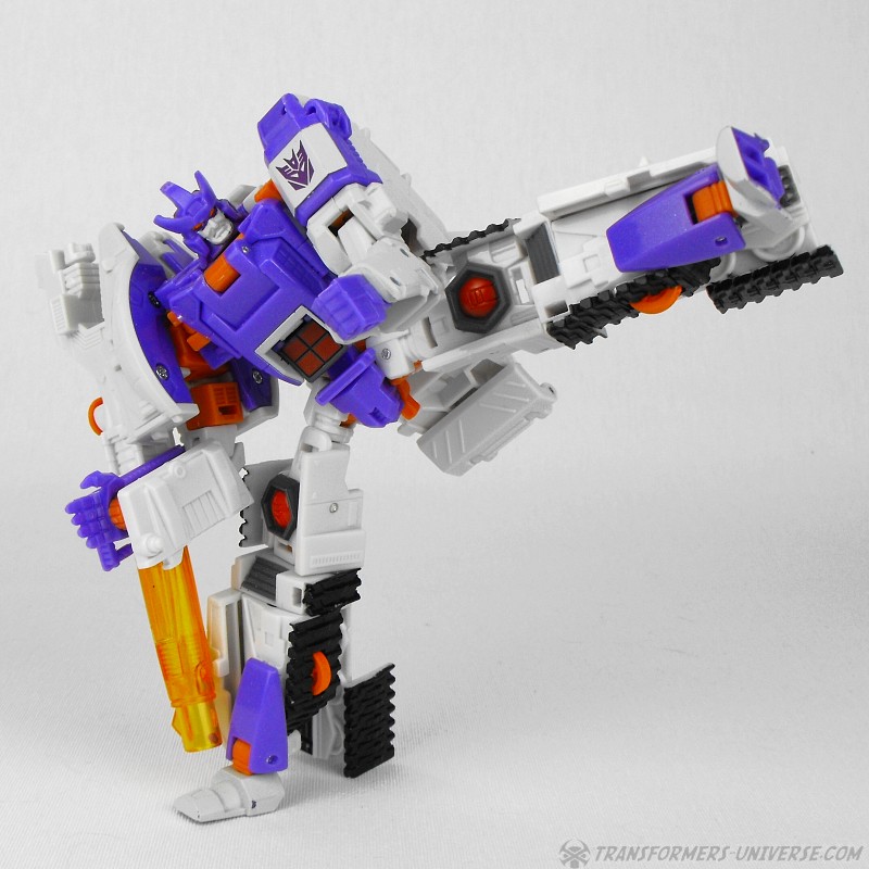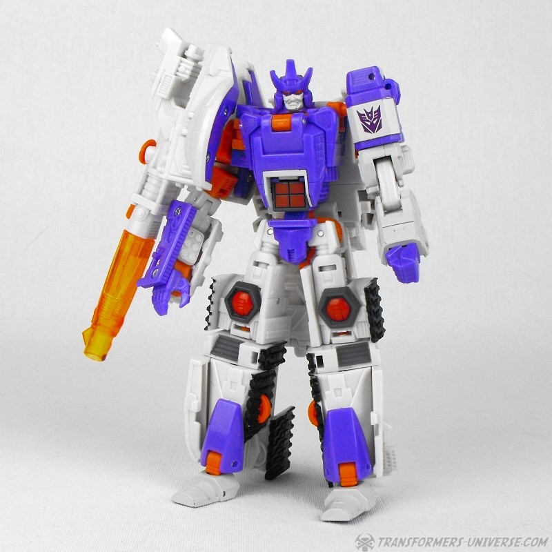 Bemerkungen: Diese Figur hier ist ein gutes Beispiel für die unterschiedliche Design-Philosophie der heutigen Generations Serie im Vergleich mit der Universe 2.0 Serie, der Sammler-Serie vor 10 Jahren. Während heute der Fokus klar darauf liegt, den (Cartoon) Look der G1 Figuren möglichst identisch umzusetzen, baute man bei Classics und Universe 2.0 mehr auf Neuinterpretation. Man erkannte die Charaktere natürlich, klar, aber sie sahen doch anders aus als damals in den Cartoons / Comics / Spielzeugregalen. Beweisstück 1: Galvatron, der zu einem irdischen Panzer wird anstatt zu einem futuristischen Laser-Artillerie-Dingens.