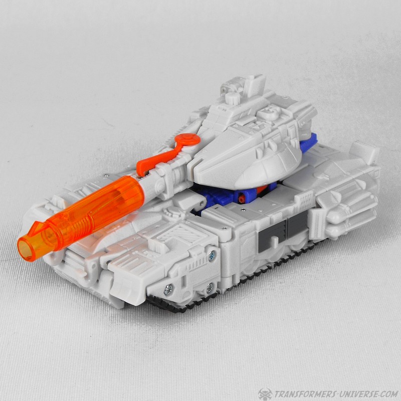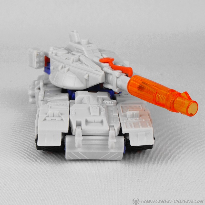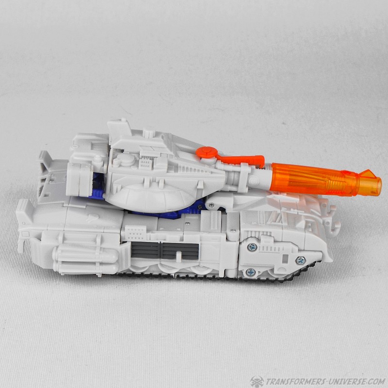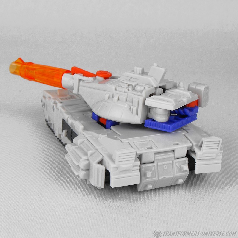 Alternativmodus: Galvatron verwandelt sich in einen hellgrauen Panzer mit orangem Geschütz. Da denkt man irgendwie als erstes an die diversen Pistolen-Megatrons mit ihren orangen Sicherheitskappen, oder? Der Panzer sieht recht realistisch aus und es gibt keine sichtbaren Roboterteile. Nur wenn man von hinten guckt kann man am Geschützturm so ein wenig die eine Roboterhand sehen, ist aber nicht wirklich schlimm. Der Geschützturm dreht sich, der Panzer rollt. Leider verschluckt die hellgraue Farbe so einige der Details, die an den dunkleren Repaints dieser Figur deutlich besser rauskommen. Trotzdem aber ein gelungener Panzermodus, lediglich etwas langweilig.