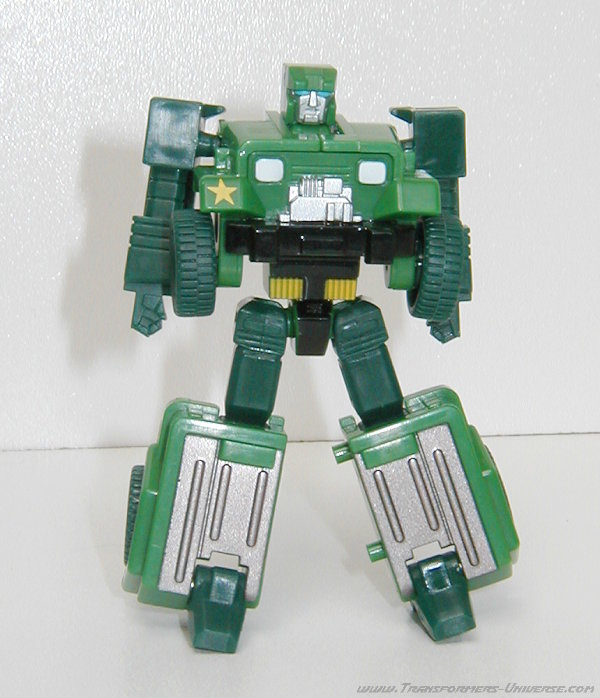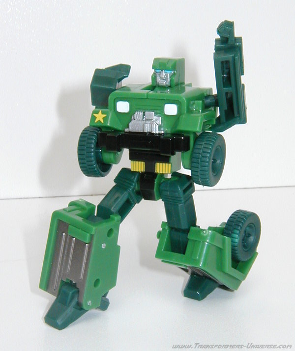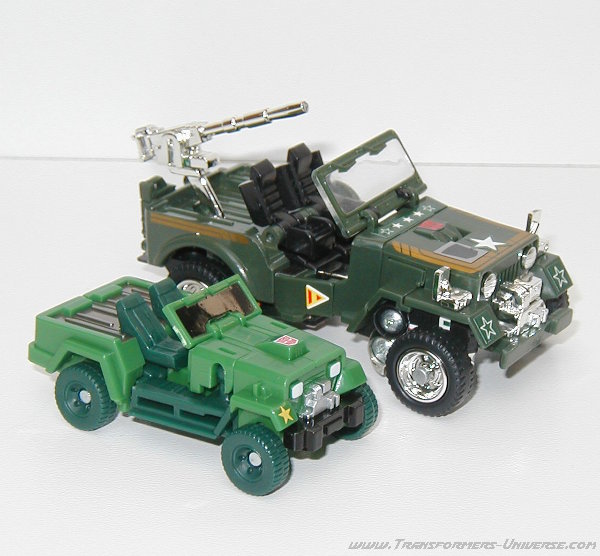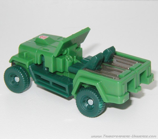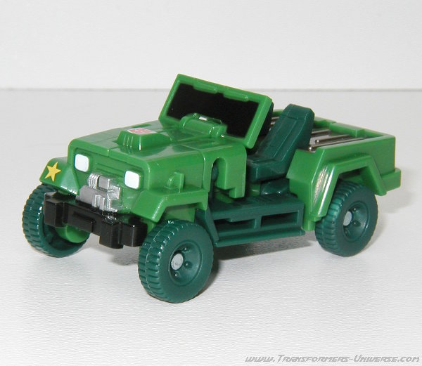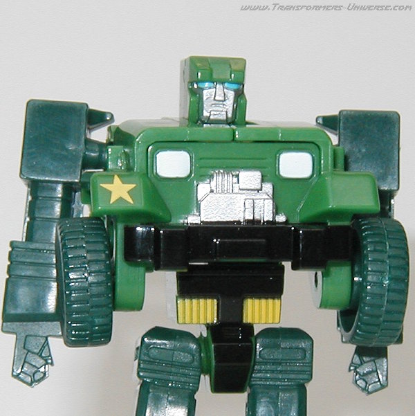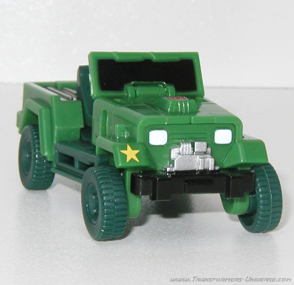 Alternativmodus: Wie schon in G1 Tagen verwandelt sich Hound in einen Armee Jeep. Die Detaillierung ist nicht ganz so umfangreich wie beim Original, für die Größe allerdings immer noch ziemlich gut. Man hat sich sogar die Mühe gemacht, im Inneren des Jeeps das Armaturenbrett ein wenig zu skulptieren. Man erkennt das Lenkrad und den Schaltknüppel. Auch im Fahrzeugmodus fehlt natürlich die Waffe, die G1 Hound hinten drauf hatte. Wäre nicht der Generalsstern auf dem rechten Kotflügel könnte Hound hier sogar als Zivilfahrzeug durchgehen. Insgesamt aber ein guter Fahrzeugmodus, keine Beschwerden.