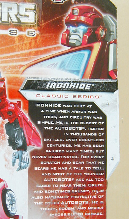 Ironhide wurde zu einer Zeit gebaut, wo Panzerung dick und Schaltkreise einfach waren. Er ist der älteste der Autobots und wurde über zahllose Jahrhunderte in tausenden Schlachten gestählt. Er wurde oft verletzt, aber nie deaktiviert. Für jede Narbe und jeden Kratzer, den er trägt, hat er eine Geschichte und die meisten jungen Autobots hören diese nur zu gerne. Er ist barsch und oft übellaunig, hat aber den anderen Autobots gegenüber einen natürlichen Beschützerinstinkt. Er ist hart, rau und fast unmöglich zu beschädigen.