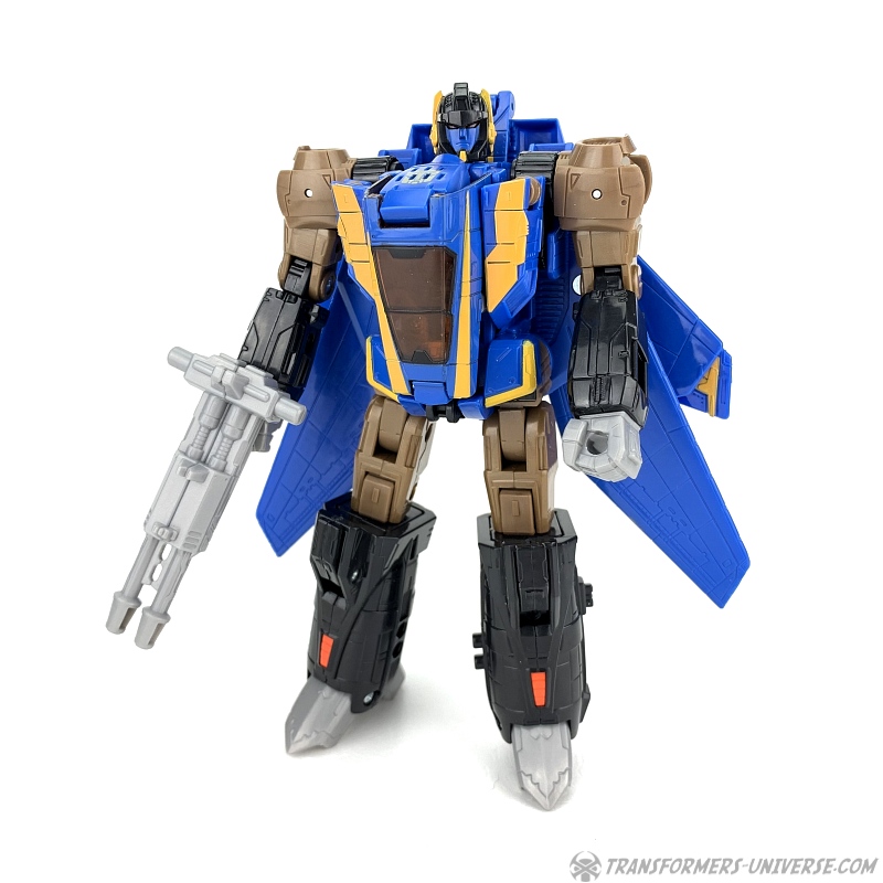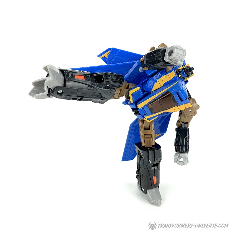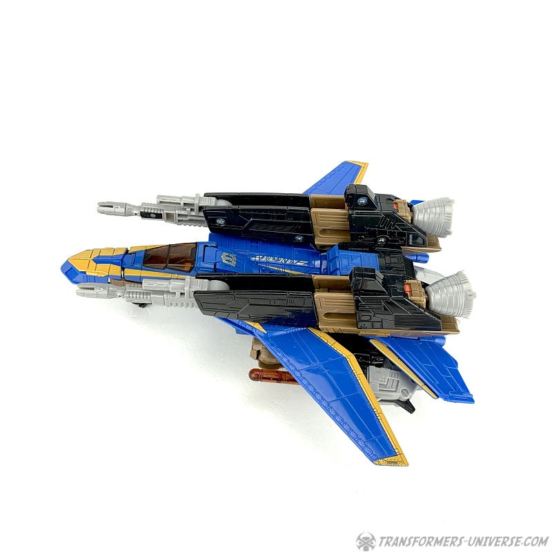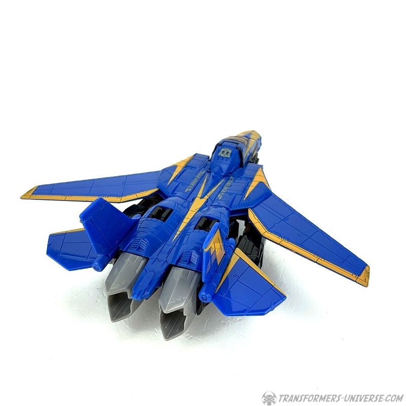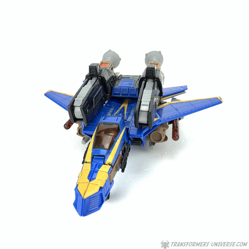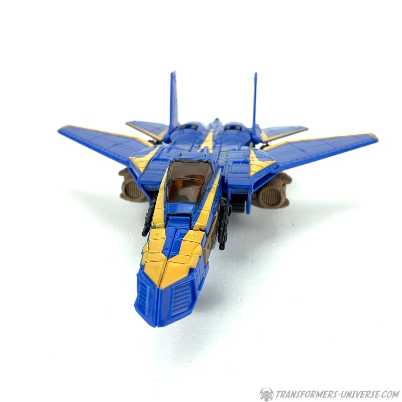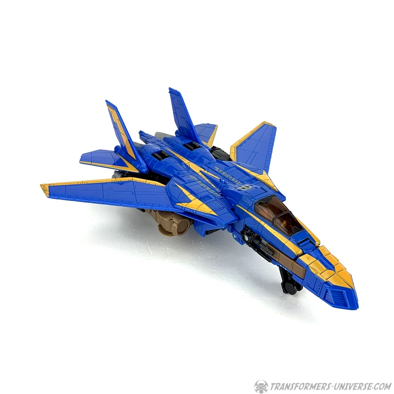 Alternativmodus: Tread Bolt verwandelt sich in einen Cybertronischen Jet, der starke Ähnlichkeit mit der alten F-14 Tomcat hat (welche die Inspiration für die Robotech Valkyrie war, uns besser bekannt als die originale G1 Jetfire Figur). Auch hier bringt die blaue Farbe die Details besser zur Geltung, wie ich finde, und der Jet sieht einfach genial aus. Ein voll funktionsfähiges Fahrgestell gibt es auch, somit keine Beschwerden an dieser Front.