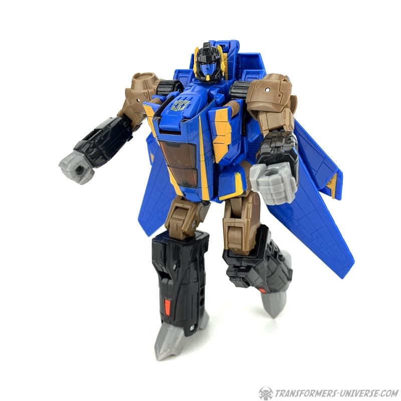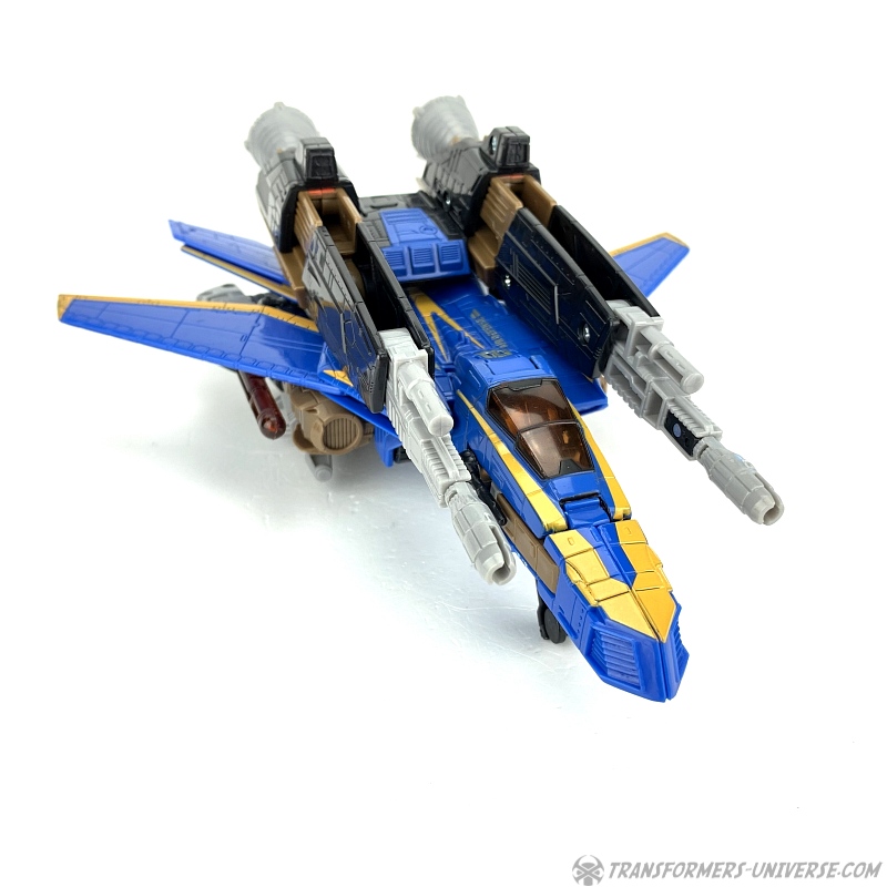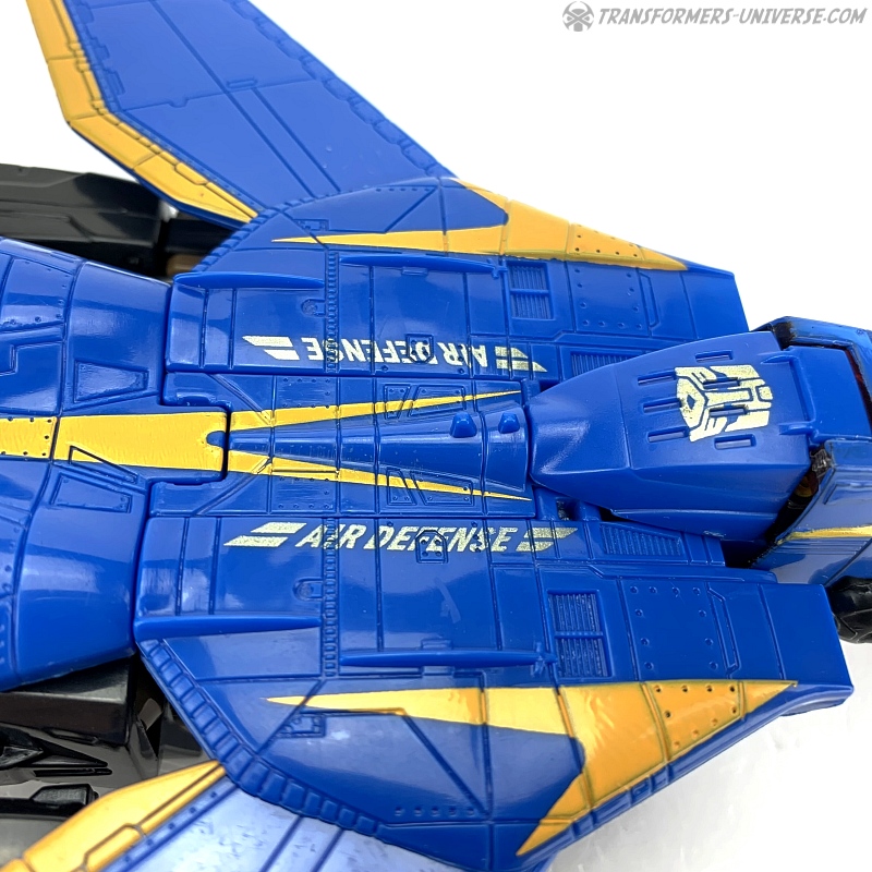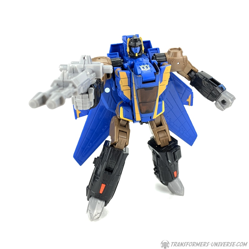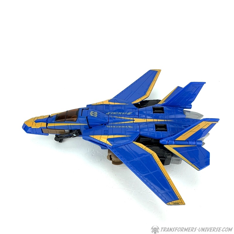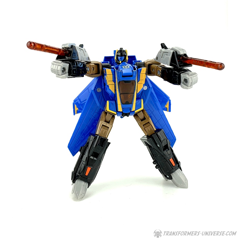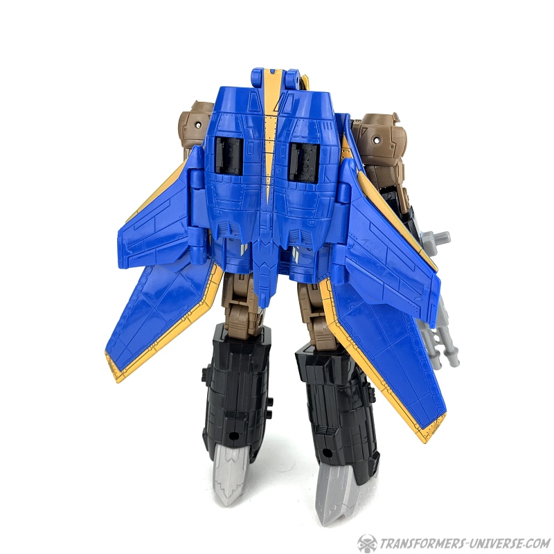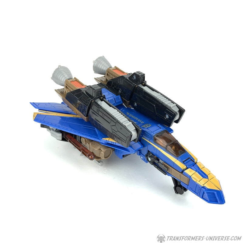 Alternativmodus: Tread Bolt verwandelt sich in einen Cybertronischen Jet, der starke Ähnlichkeit mit der alten F-14 Tomcat hat (welche die Inspiration für die Robotech Valkyrie war, uns besser bekannt als die originale G1 Jetfire Figur). Auch hier bringt die blaue Farbe die Details besser zur Geltung, wie ich finde, und der Jet sieht einfach genial aus. Ein voll funktionsfähiges Fahrgestell gibt es auch, somit keine Beschwerden an dieser Front.