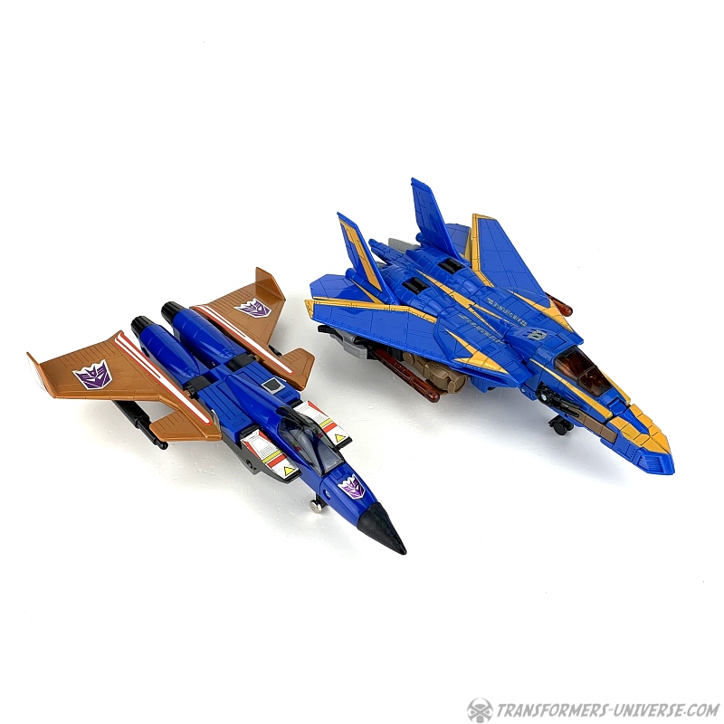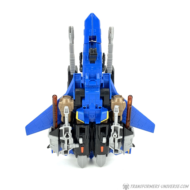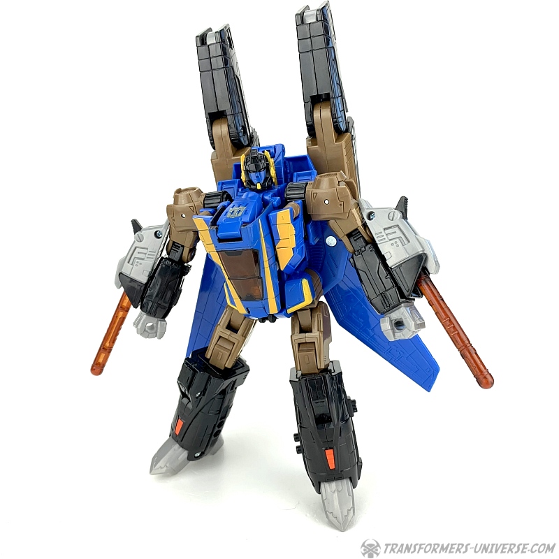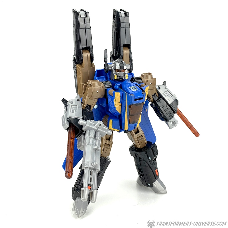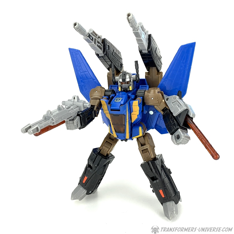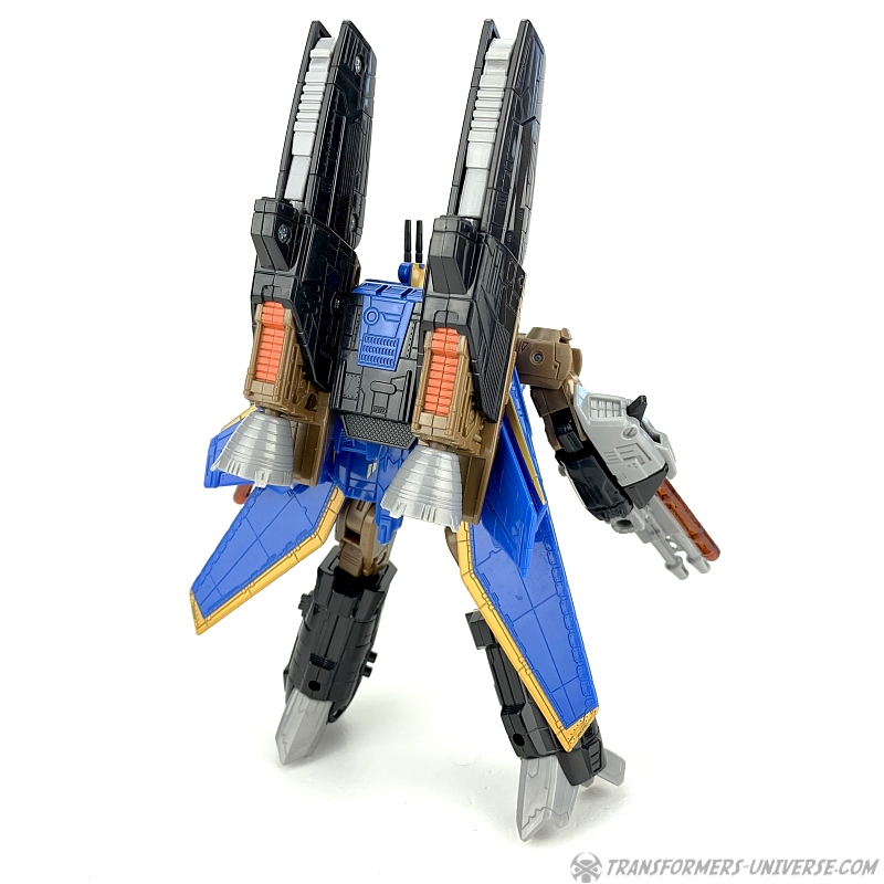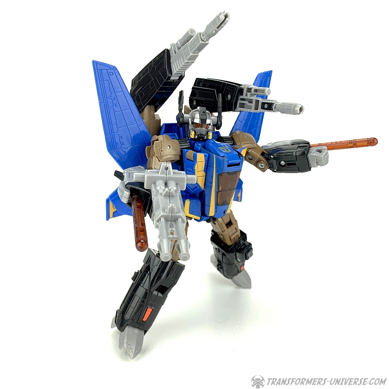 Alternativmodus: Tread Bolt verwandelt sich in einen Cybertronischen Jet, der starke Ähnlichkeit mit der alten F-14 Tomcat hat (welche die Inspiration für die Robotech Valkyrie war, uns besser bekannt als die originale G1 Jetfire Figur). Auch hier bringt die blaue Farbe die Details besser zur Geltung, wie ich finde, und der Jet sieht einfach genial aus. Ein voll funktionsfähiges Fahrgestell gibt es auch, somit keine Beschwerden an dieser Front.
