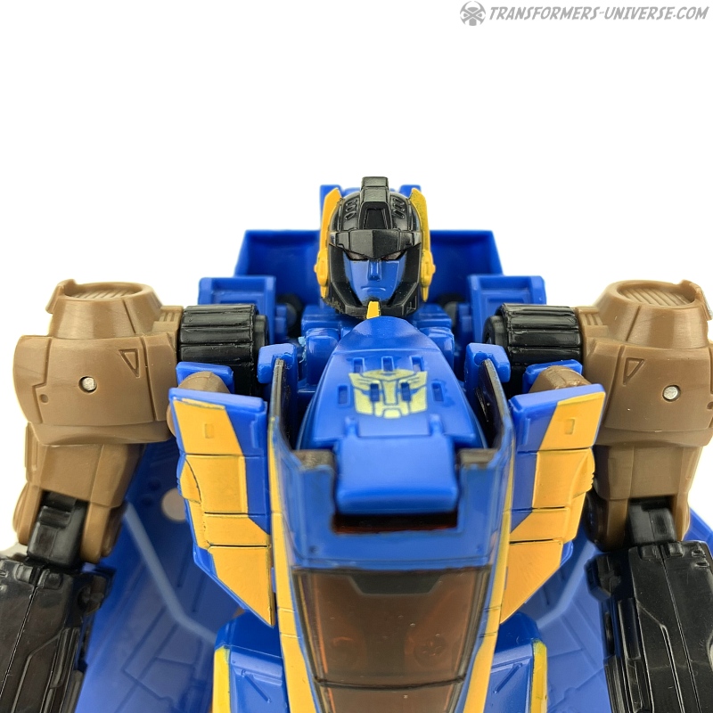 Der eigentliche Robotermodus ist ziemlich nahe am Design der ursprünglichen G1 Jetfire Figur, nur etwas kantiger um auch dem Cartoon Charakter Skyfire mehr zu ähneln. Die blaue Farbe mit den orange-beigen Akzenten bringt die Details deutlich besser heraus als das Weiß von Jetfire/Skyfire, wie ich finde. Kleine Randnotiz: auf den Promobildern der Figur sieht man irgendwie nie seinen Kopf ohne Helm. Natürlich ist es der gleiche Kopf wie bei Jetfire, aber auch hier: die anderen Farben machen einen gewaltigen Unterschied, wie ich finde. Tread Bolt sieht einfach genial aus.