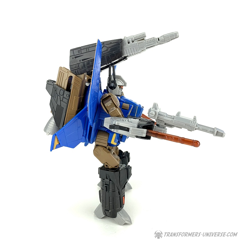 Alle Extrateile von Tread Bolt können auch in diesem Modus angebracht werden und präsentieren uns dann eine schwer bewaffnete Flugmaschine. Seht euch die Bilder an und schwelgt und fliegender Militärpower! Interessanterweise ist Tread Bolt auch mit dem gesamten Arsenal immer noch einigermaßen aerodynamisch, etwas das nicht viele Jetformer hinkriegen. Das Cockpit lässt sich öffnen, allerdings sieht man darin lediglich Tread Bolts (behelmten) Kopf. Unterm Strich somit: ein süperber Jetmodus, keinerlei Beschwerden.