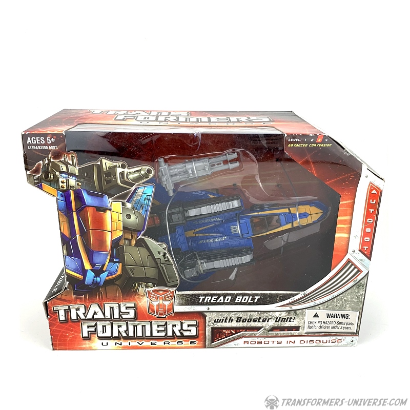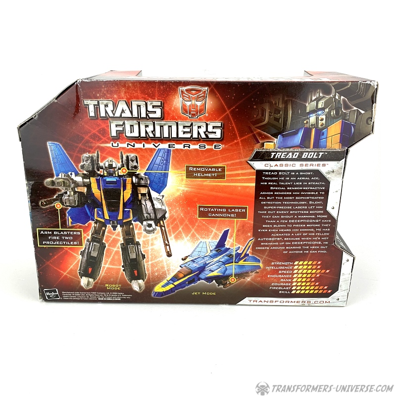 Vorwort: Er begann 1990 als Micromaster als Teil der Air Patrol. Dann akquirierte er ein neues Chassis, welches vorher von Classics Jetfire und Henkei! Henkei! Skyfire genutzt wurde. Das nahm er und malte es in seinen klassischen G1 Farbe an (mit ein wenig Einfluss von Dirge, wie ich finde), um damit in der 2008er Universe Reihe anzutreten. Hier haben wir ihn also, Universe Tread Bolt, voll ausgewachsen und bereit zu kämpfen. Ich habe diesen Mold ja bereits zweimal rezensiert, aber das letzte Mal ist 10 Jahre her, also gönnen wir uns mal eine weitere Runde. Los geht’s!