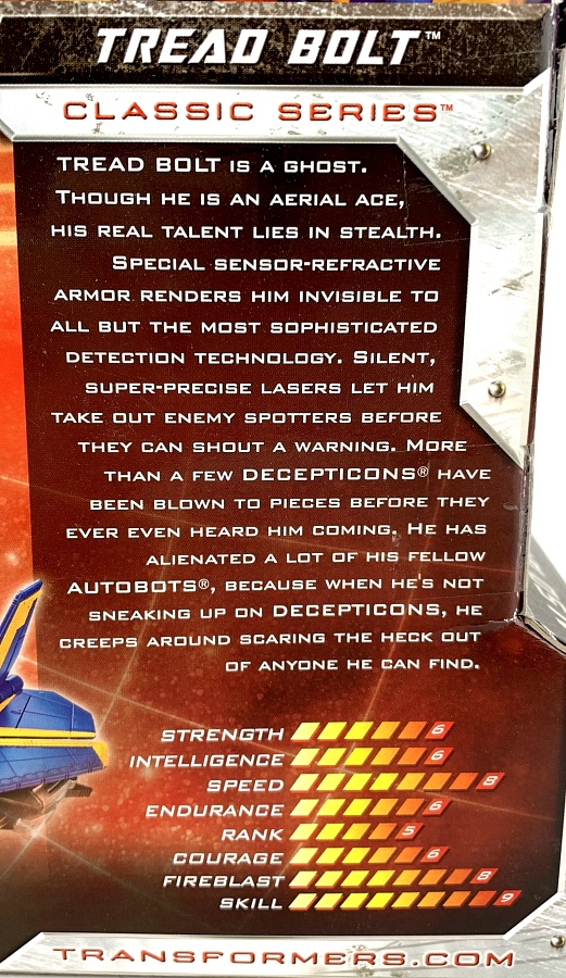 Tread Bolt ist ein Geist. Obwohl er ein Ass im Luftkampf ist, liegt sein wahres Talent in der Tarnung. Spezielle Sensoren-ablenkende Panzerung macht ihn praktisch unsichtbar für jede Erfassungstechnologie. Leise, super-präsise Laser erlauben es ihm, feindliche Späher auszuschalten, bevor sie eine Warnung absetzen können. Mehr als nur ein paar Decepticons wurden in Stücke geschossen, bevor sie ihn überhaupt kommen hörten. Er hat es sich mit vielen Autobots verscherzt, denn wenn er sich nicht an Decepticons anschleicht, dann jagt er auch gerne seinen Kameraden einen Schrecken ein.