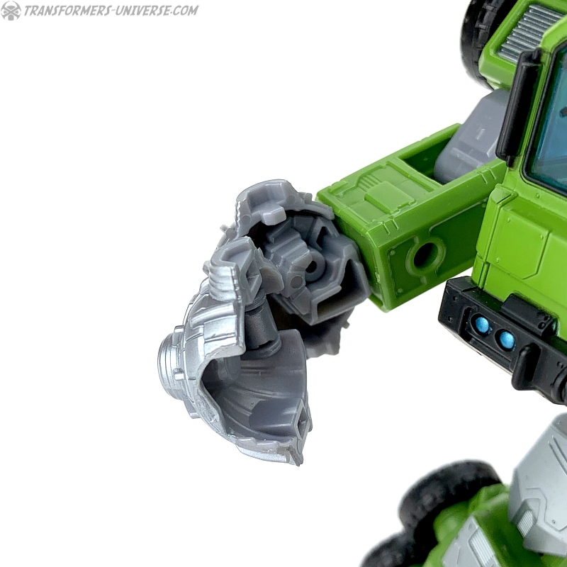 In den letzten zehn Jahren haben ja einige Fans den Begriff „Geewunn-ifikation“ geprägt, also der Prozess, bei dem ein Charakter von außerhalb G1 so umdesignt wird, dass er wie eine G1 Figur im Generations-Stil aussieht. Was eigentlich sehr gut beschreibt, was wir hier vor uns haben. Hätte der Charakter Bulkhead sein Debüt in G1 anstatt Animated gehabt, dann hätte er vermutlich ungefähr so ausgesehen. Eine kastenförmige Brust mit Fensterscheiben, die generischen Truck-Bot Beine mit Doppelreifen an jeder Seite, Reifen an den Schultern, kennen wir alles. Somit haben wir hier also einen mehr oder minder generischen G1 Truck-Bot mit einem Kopf, der aussieht wie der von Bulkhead.
