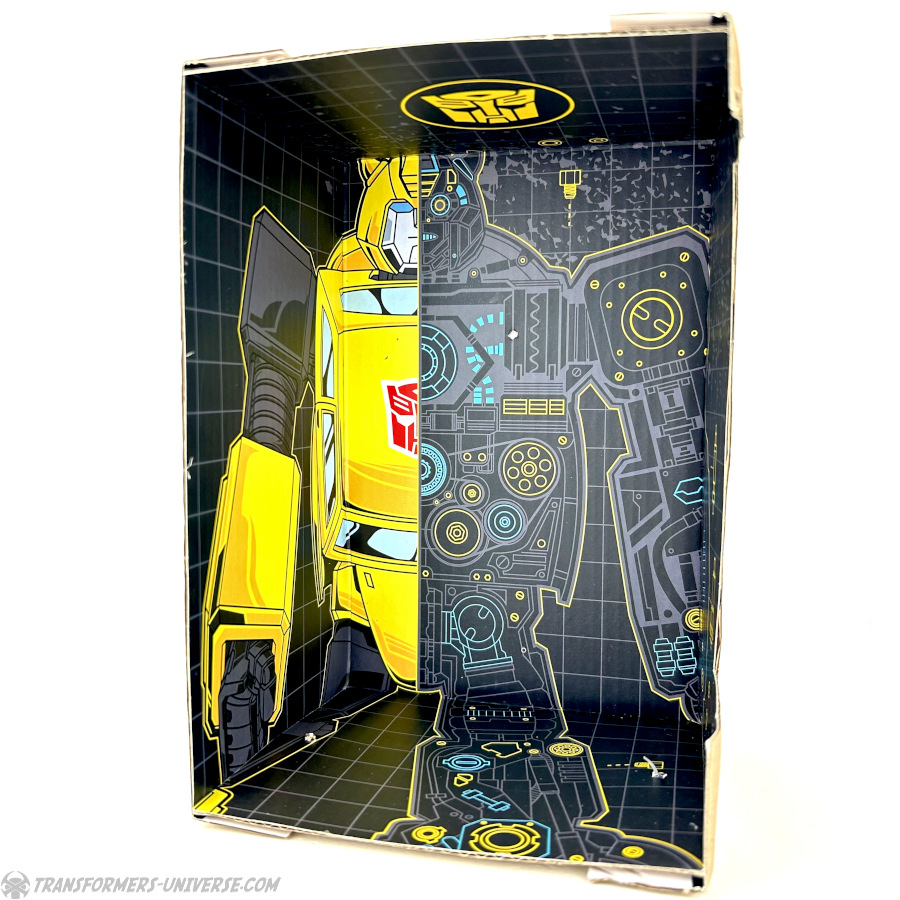 Die Packung ist fast interessanter als das Plüschspielzeug selbst. Das Innere zeigt ein ziemlich cooles Artwork von G1 Bumblebee (in seiner normalen, nur leicht süßen Gestalt), auch hier in der Mitte geteilt damit man sein inneres Design sieht. Die äußere Packung zeigt auf der Rückseite eine Zeichnung des Plüschspielzeugs selbst, so positioniert dass die Trennlinie zwischen Außen- und Innenansicht genau auf der Kante der Packung liegt. Schön gemacht.