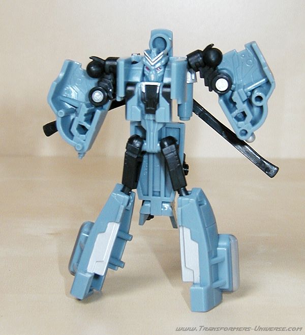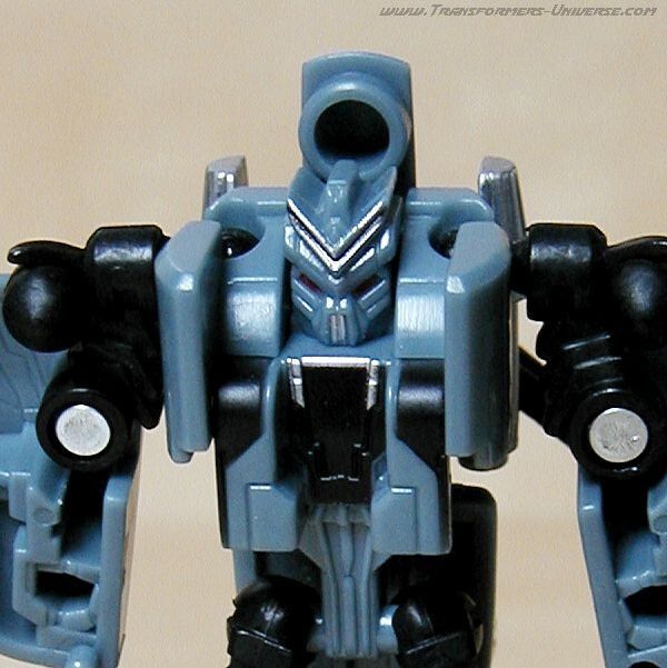 Robotermodus: Trotz deutlicher Unterschiede im Design sieht Legends Blackout seinem großen Bruder Voyager Blackout sehr ähnlich, man kann ihn also ohne Probleme identifizieren. Er ist natürlich kleiner und deutlich weniger detailliert, aber das war ja zu erwarten. Die Beweglichkeit der Figur ist ordentlich. Er kann die Arme an den Schultern frei bewegen, ebenso die Beine an der Hüfte. Die Knie können leider nur seitlich gebogen werden, ansonsten aber keine Beschwerden. Für eine Figur dieser Größe ist er ein anständiger kleiner Roboter.