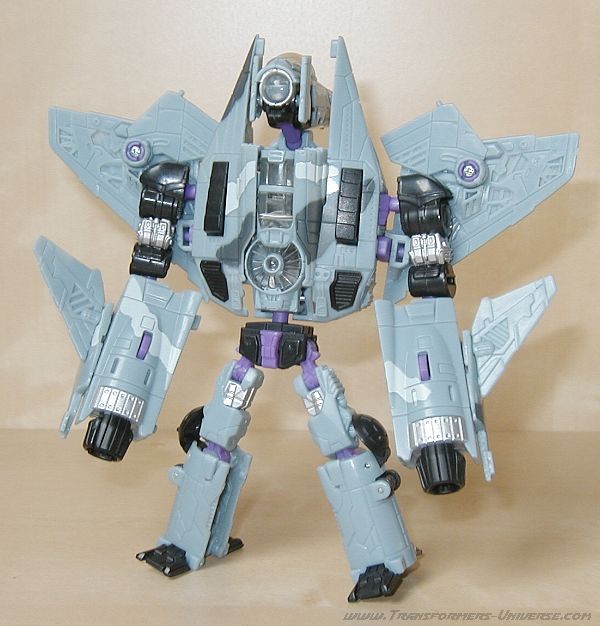 Fahrzeugmodus: Dreadwing macht seinen schlechten Robotermodus durch einen exzellenten Fahrzeugmodus zumindest teilweise wieder wett. Ein hervorragender und gut skulptierter Kampfjet. In diesem Modus hat Dreadwing nur ein kleines Problem, nämlich den großen Unterbau (die Beine des Robotermodus), der ein wenig zu groß für einen realistischen Jet ist. Davon abgesehen aber alles super. Sehr detailliert, realistisch, und mit einem Gimmick, welches die Raketen in den Jet-Triebwerken als Auspuffflammen benutzt. Gut gemacht.