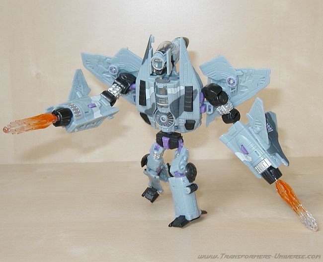 Hätte er jetzt noch wenigstens Hände, könnte ich ihm vielleicht etwas abgewinnen. Aber stattdessen sitzen an der Stelle seine Triebwerke, aus denen die Düsenflammen als Raketen abgefeuert werden können. Das ist ja auch gar nicht so schlimm, aber hätte man die Triebwerke nicht wenigstens in eine Art Zange verwandeln können, damit Dreadwing wenigstens so etwas ähnliches wie ein Greifwerkzeug hat? Nun, offensichtlich ging das nicht.
