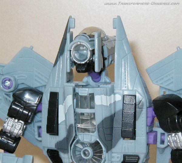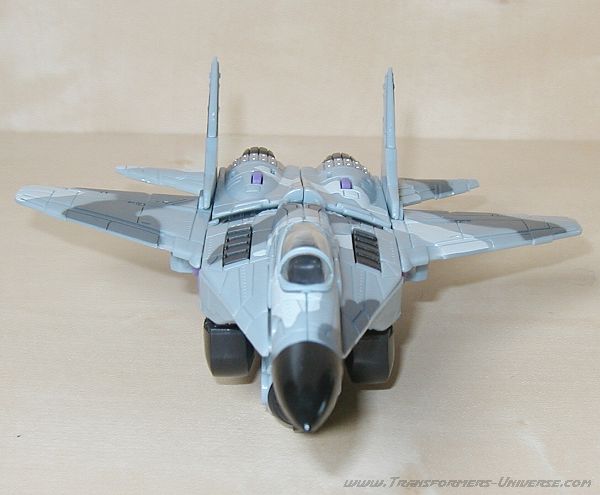 Der Jet ist sehr detailiert und wirklich gut gearbeitet. Dreadwings Tarnfarben kommen hier ebenfalls sehr gut zur Geltung. Ich kann hier wirklich nicht vielmehr sagen, als daß Dreadwing in seiner Flugzeugform wirklich toll aussieht. Einzig der „Zylinder“ unter dem Jet wirkt ein wenig seltsam. Dort befinden sich Dreadwings Beine. Allerdings kann es sich bei dieser Konstruktion durchaus um eine Art Zusatztank handeln. Jedenfalls wirkt das Ding nicht störend und tut der recht hohen Qualität von Dreadwings Alternativmodus keinen Abbruch.