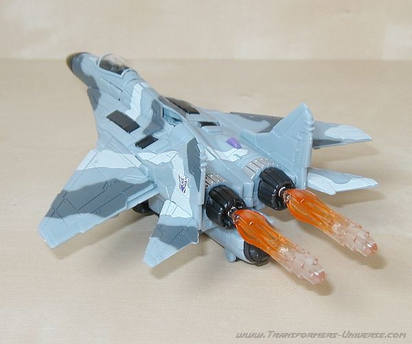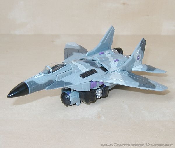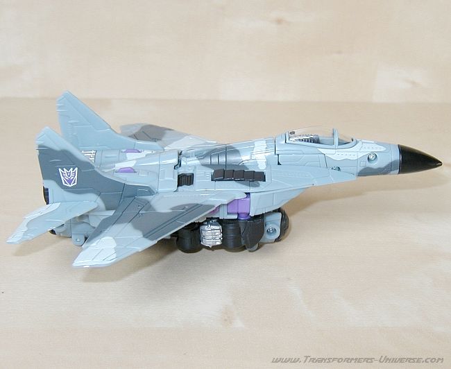 Alternativmodus: Dreadwings Alternativmodus ist ein Düsenjäger. Vermutlich soll es sich dabei um eine Mig-29 handeln. Jedenfalls sieht der Jet diesem russischen Flugzeug sehr ähnlich. Und überraschenderweise ist Dreadwings Flugzeugmodus das genaue Gegenteil seiner Roboterform.