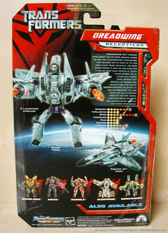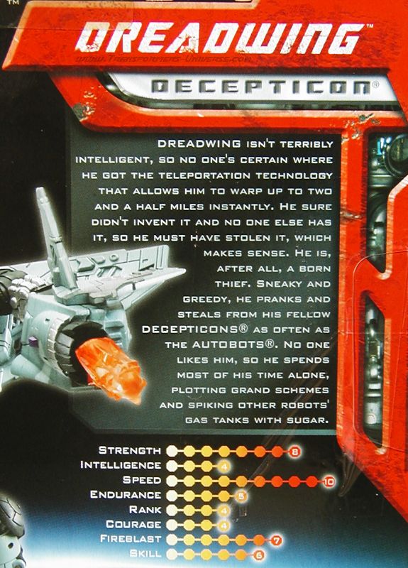 Dreadwing ist nicht gerade intelligent, insofern weiß keiner, woher er die Teleportationstechnologie hat, die ihm erlaubt, sich bis zu zweieinhalb Meilen weit in Nullzeit zu transportieren. Er hat sie mit Sicherheit nicht erfunden und da sie sonst niemand hat, muss er sie wohl gestohlen haben, was Sinn macht. Schließlich ist er der geborene Dieb. Verschlagen und gierig spielt er Streiche und klaut sowohl von seinen Decepticon Kameraden wie auch den Autobots. Keiner mag ihn, die meiste Zeit verbringt er deshalb alleine, große Pläne schmiedend und Zucker in den Treibstofftank anderer Roboter füllend.