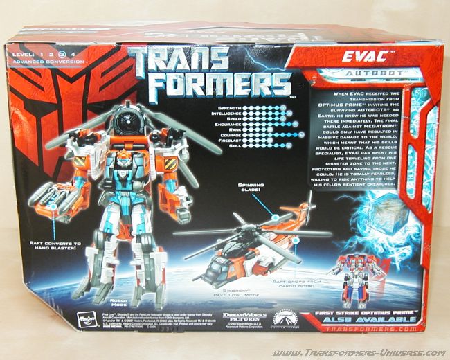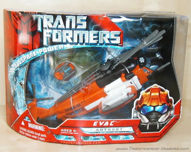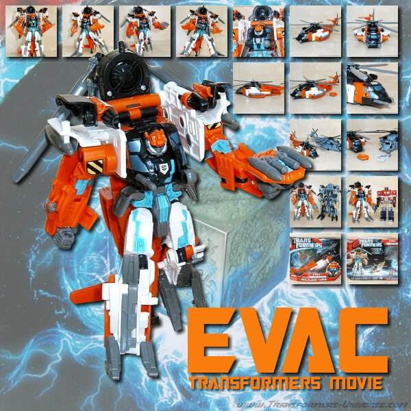 Evac stellt lt. Produktbeschreibung einen der ersten Autobots dar, welcher nach Optimus' Ruf ins All auf die Erde gekommen ist. Da sein Name wohl von "Medivac" abgeleitet ist, scheint er eine Art Sanitäter darzustellen - also einen fliegenden Ratchet - nur eben erheblich größer.