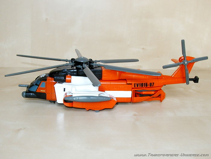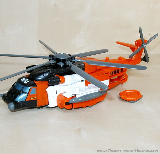 Vorwort: Evac ist zwar "nur" ein Repaint von Blackout, dennoch weist er klare Unterschiede auf. Der Kopf wurde komplett remodelliert, Scorponok wurde "mal eben" flugs in eine Rettungsinsel inklusive Zelt transformiert. Eben jene Insel kann übrigens zu einem Blaster umgebaut werden.