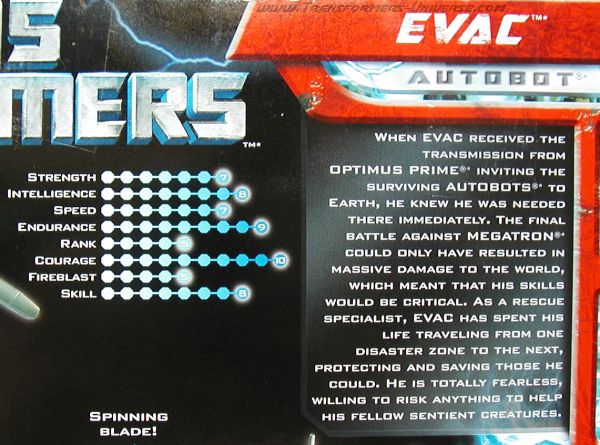 Als Evac den Funkspruch von Optimus Prime empfing, der alle überlebenden Autobots zur Erde einlud, wusste er, dass er dort sofort gebraucht werde würde. Der letzte Kampf gegen Megatron musste dem Planeten schwerste Schäden zugefügt haben, seine Fähigkeiten würden also benötigt. Als Rettungsspezialist hat Evac sein ganzes Leben damit verbracht von einem Katastrophengebiet zum nächsten zu reisen und alle zu beschützen und zu retten, die er nur konnte. Er ist vollkommen furchtlos und bereit alles zu riskieren, um anderen Lebewesen zu helfen.
