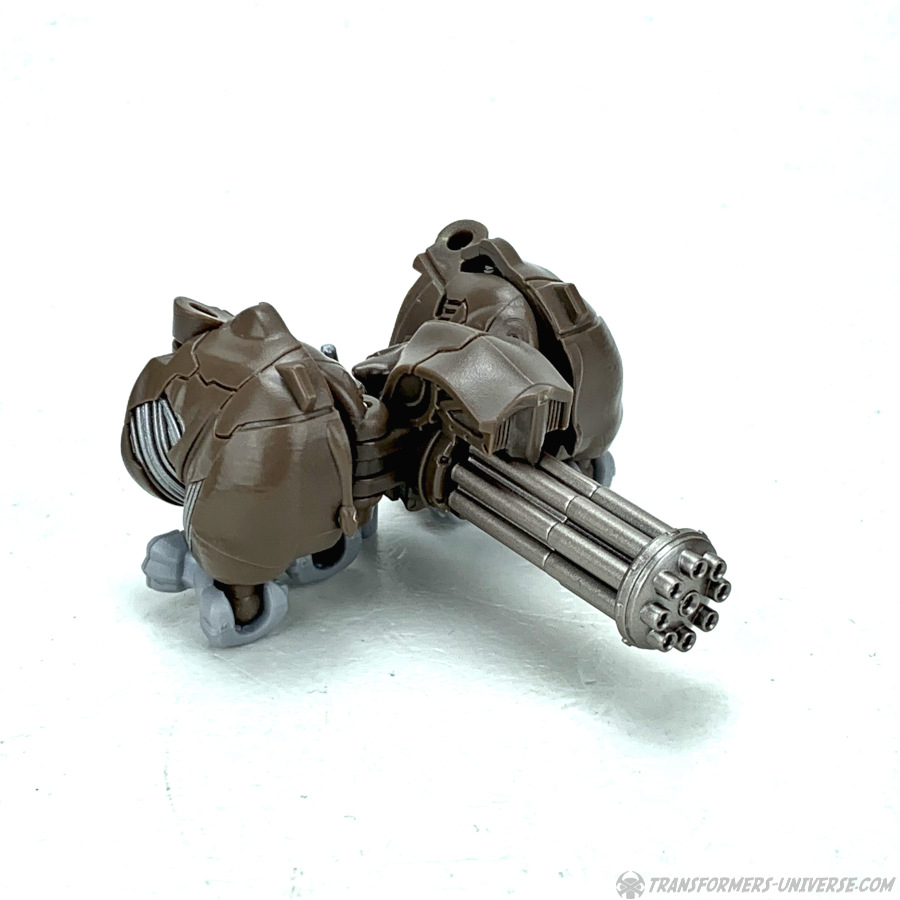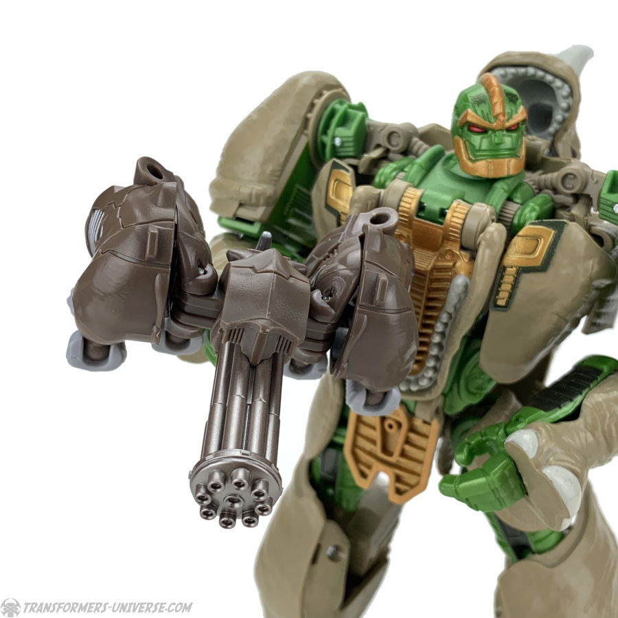Waffenmodus: Rhinox transformiert sich zu einem großen Gatling Maschinengewehr (gerne auch Mini-Kanone genannt) und wenn ich transformieren schreibe, dann meine ich dass der Körper einmal der Länge nach aufklappt und die Mündung der Kanone dort ist, wo vorher Rhinox‘ Zündloch war. Ein Griff klappt unten aus dem Kopf des Nashorns aus und die beiden Körperhälften falten zusammen, somit hat man am Ende eine anständig aussehende Kanone mit etwas organisch-angehauchtem Kibble rechts und links.