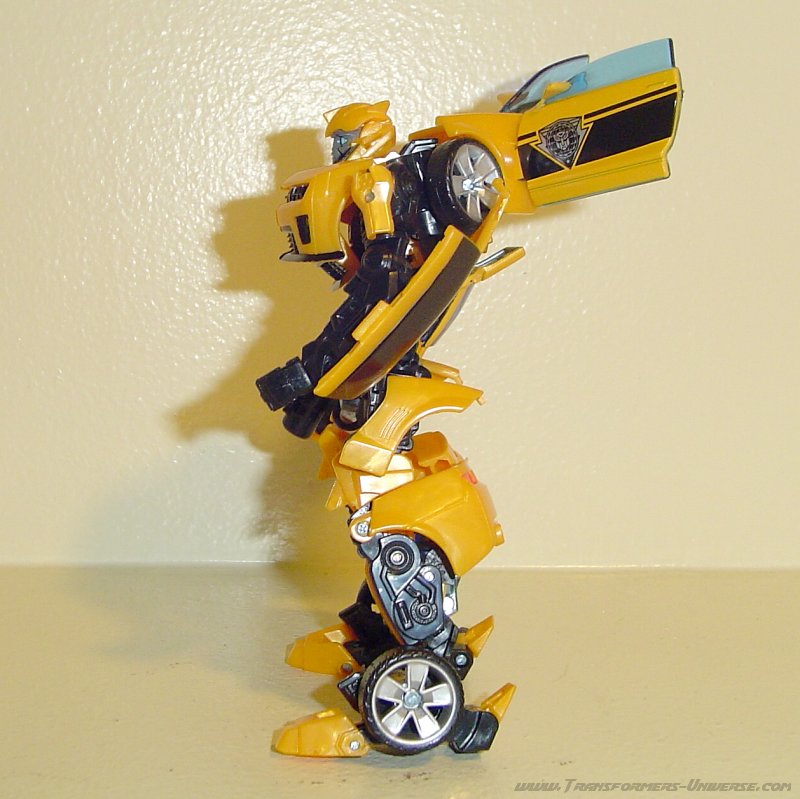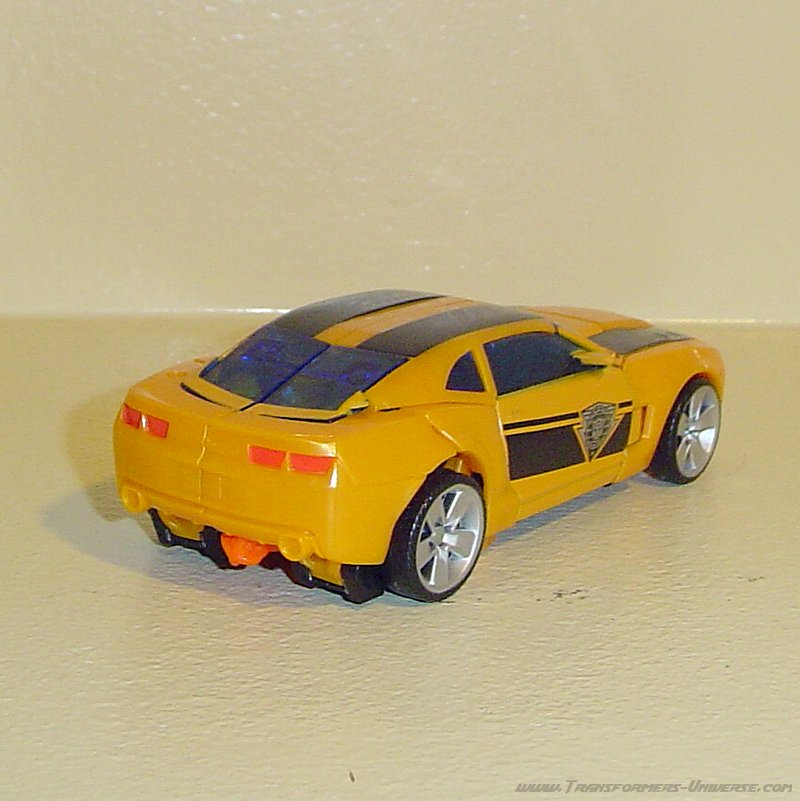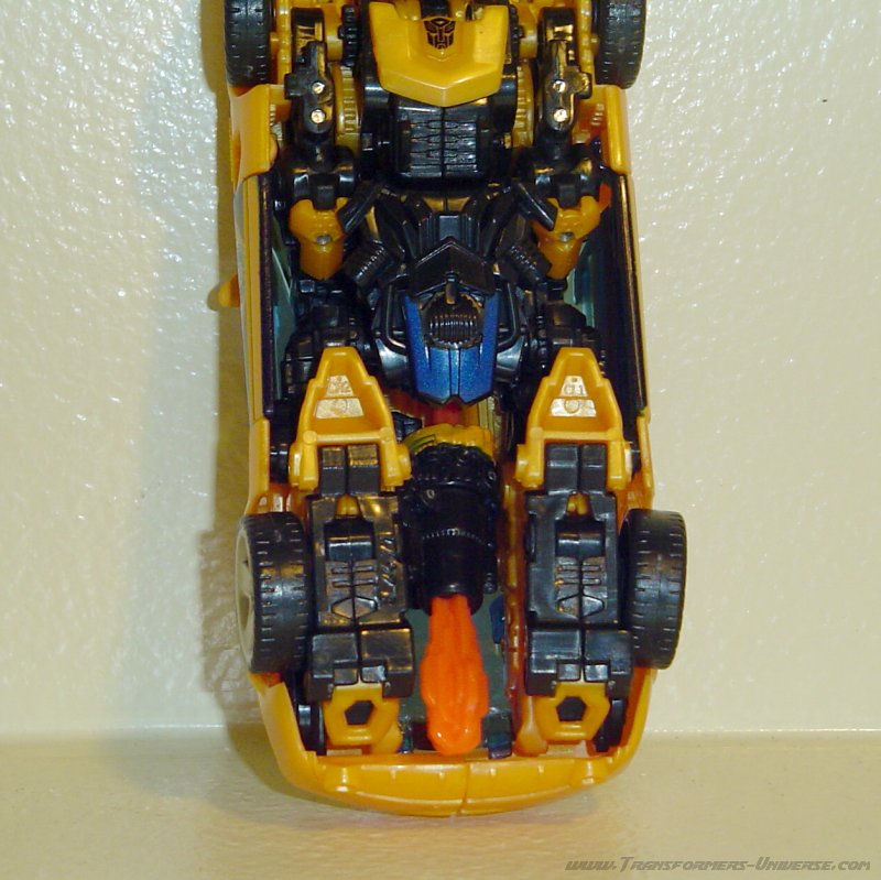 Die Rakete kann in diesem Modus verstaut werden, indem man sie unten wieder in die Waffe einsteckt. Ich empfehle jedoch, sie während der Transformation rauszunehmen. Die Außenhülle des Autos ist zwar schon ein wenig Stückwerk, aber die schwarzen Streifen verbergen die Übergänge gut. Das einzige kleine Manko hier ist, dass man von der Seite und hinten die Füße des Roboters sehen kann. Trotzdem ein phantastisches Stück für jede Sammlung, speziell wenn ihr auch mal einen Bumblebee mehr kauft.