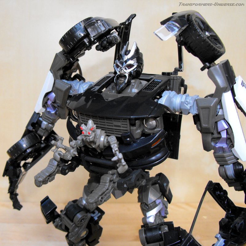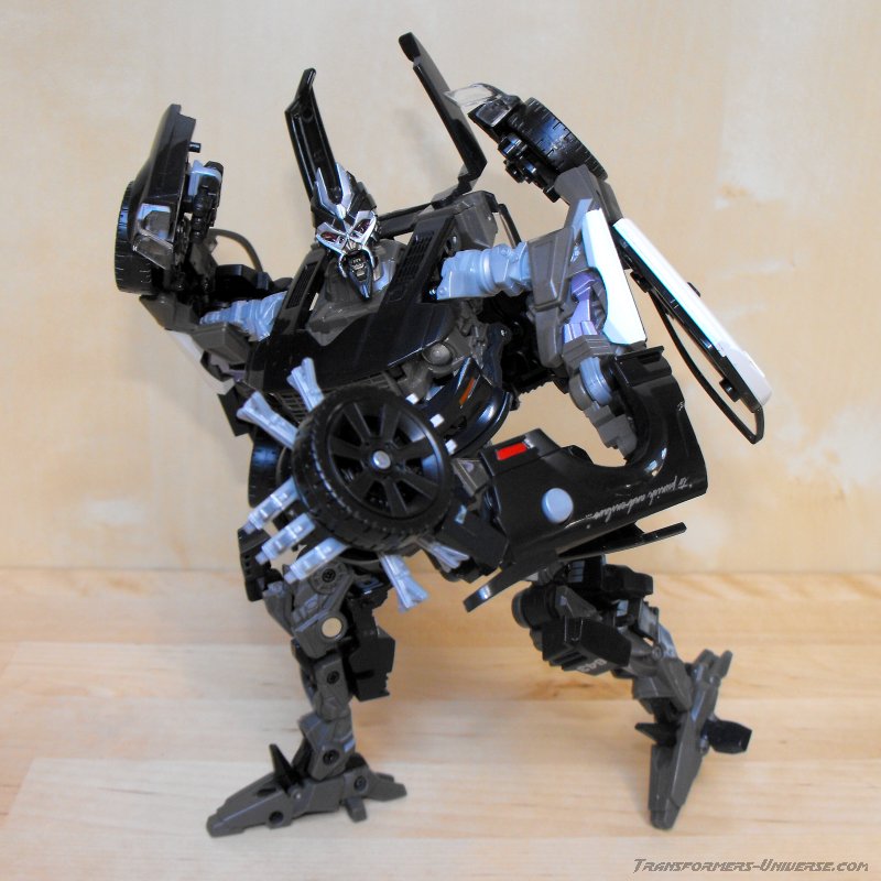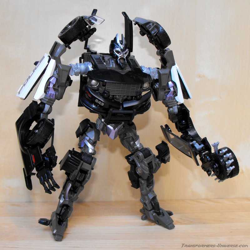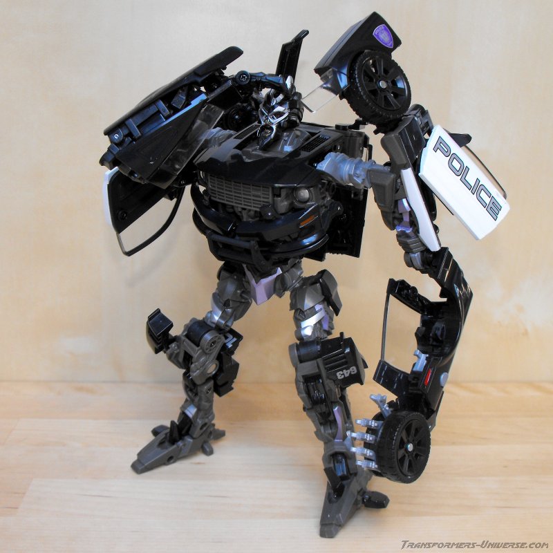 Robotermodus: Barricades grundlegendes Design hat sich gegenüber seiner ursprünglichen Deluxe Version kaum verändert, außer dass er jetzt eher in der Voyager / Alternator Größenklasse daheim ist. Er hat immer noch das Standard Motorhaube-als-Brust Design, die Seiten des Autos werden zu den Armen, das Heck des Autos zu den Beinen. Die zusätzliche Größe gibt ihm allerdings eine verbesserte Detaillierung, größere Beweglichkeit und einen Film-akkurateren Look.