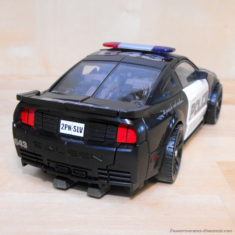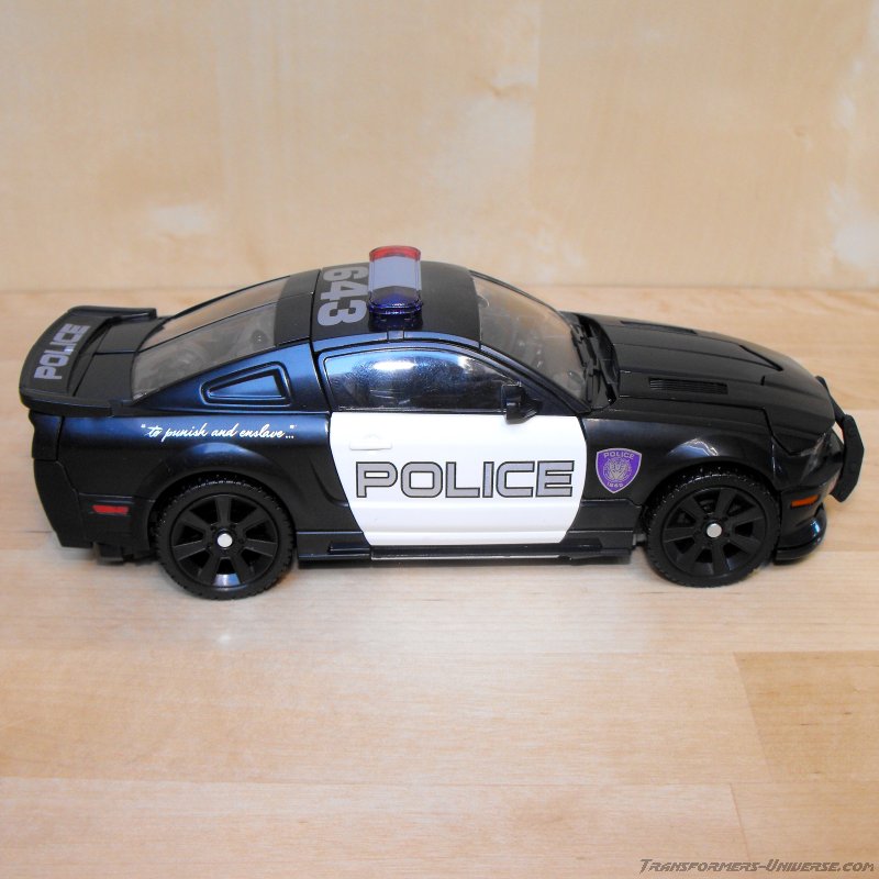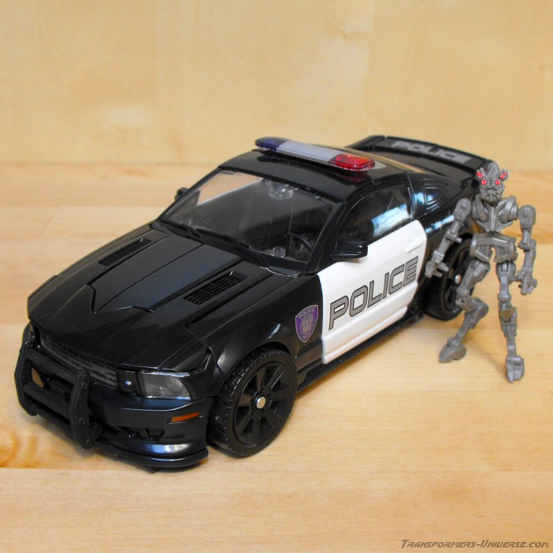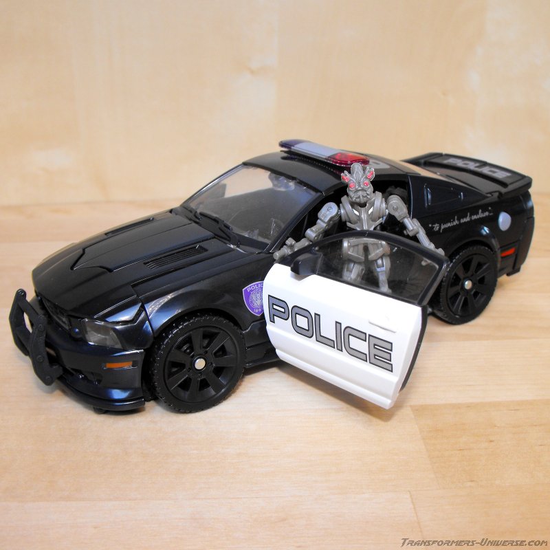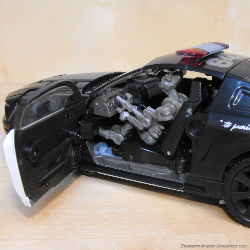 Fahrzeugmodus: Barricade verwandelt sich natürlich immer noch in ein schwarzes Polizeiauto und von der Größe und einigen kleinen Details abgesehen ist das Auto mit dem Fahrzeugmodus der Deluxe Version praktisch identisch. Zumindest von außen. Was Human Alliance Barricade abhebt, ist das Innere. Öffnet man die Autotüren bietet sich einem ein tatsächlicher Innenraum mit Sitzen, wo die Frenzy Figur (siehe unten) Platz nehmen kann. Es gibt ein Lenkrad und ein Amaturenbrett. Keine Rücksitze, aber das wäre wohl auch unmöglich gewesen. Irgendwo müssen die Roboterbeine ja hin. Alles in allem also ein sehr, sehr schöner Fahrzeugmodus. Keinerlei Beschwerden.