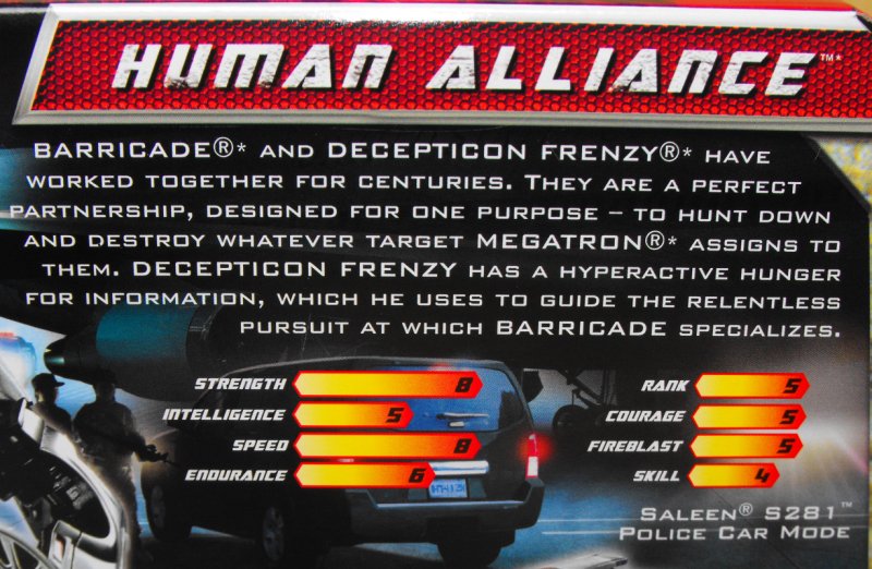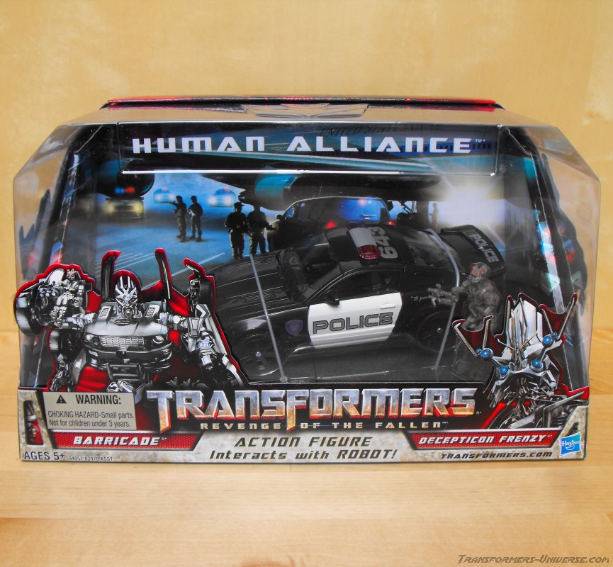 Bemerkungen: Obwohl Barricade im Kinofilm Transformers: Die Rache nicht dabei war, ist er in der zugehörigen Spielzeugreihe doch mehrfach präsent. Unter anderem ist er der bisher einzige Decepticon in der Human Alliance Reihe, was auch nicht weiter überrascht, denn es gibt nicht wirklich viele Decepticons, die sich mit Menschen verbünden (Dr. Arkeville ist bisher nicht im Movieversum präsent). Das tut Barricade natürlich auch nicht, aber Frenzy hat zumindest menschliche Größe (also im Film), weshalb er hier den Platz eines menschlichen Fahrers einnehmen kann. Barricade und Frenzy waren im ersten Teil wohl die Decepticons mit den meisten Auftritten, insofern ist es schön, sie hier wieder zu sehen, auch wenn Frenzy definitiv tot ist.